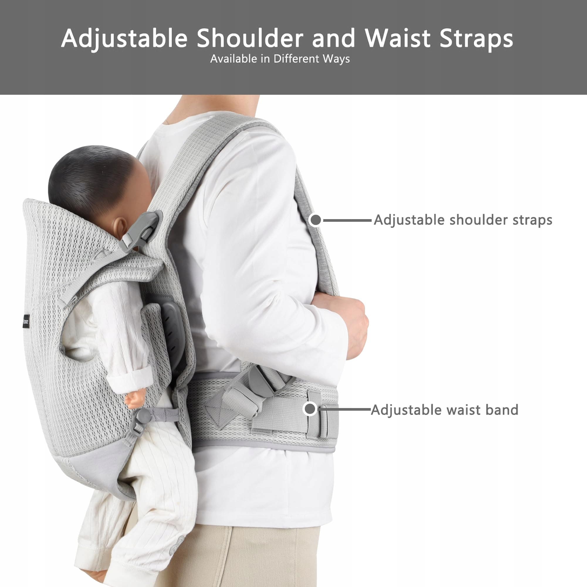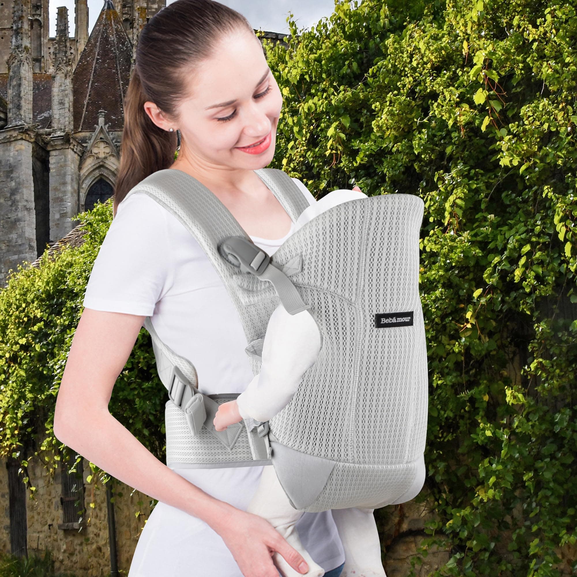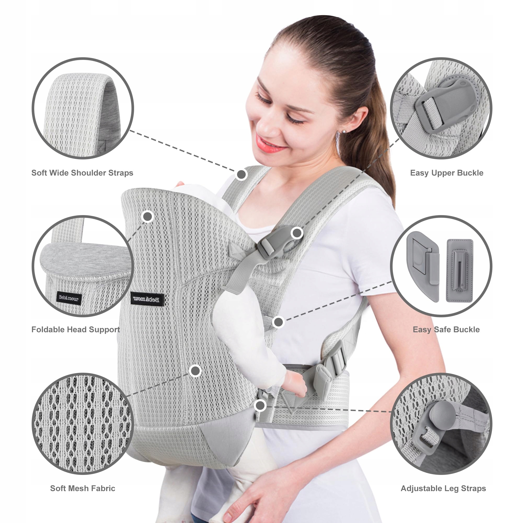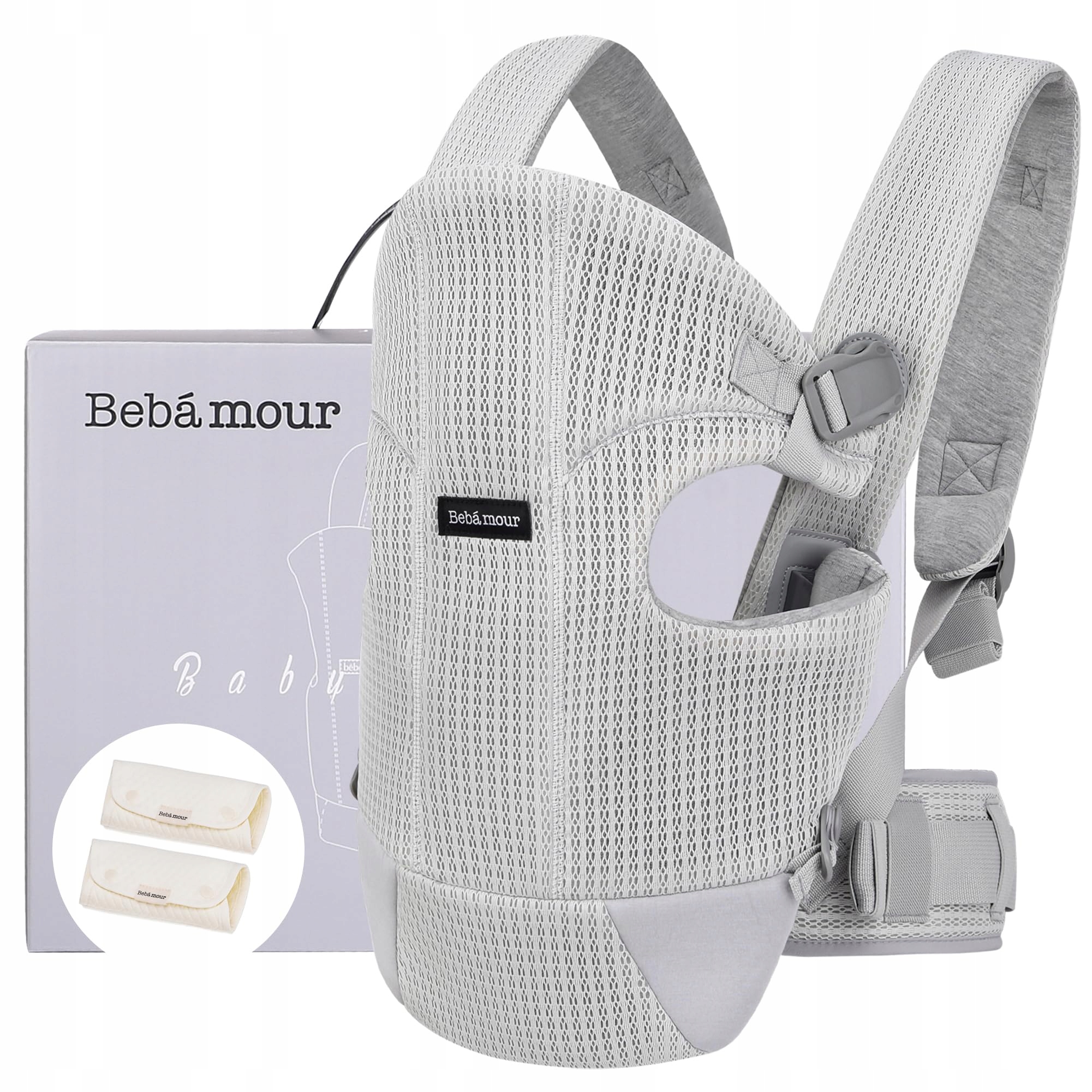 Nosidełko Bebamour dla dzieci z przodu i z tyłu z 2 ochraniaczami na ramiona, Jasnoszare