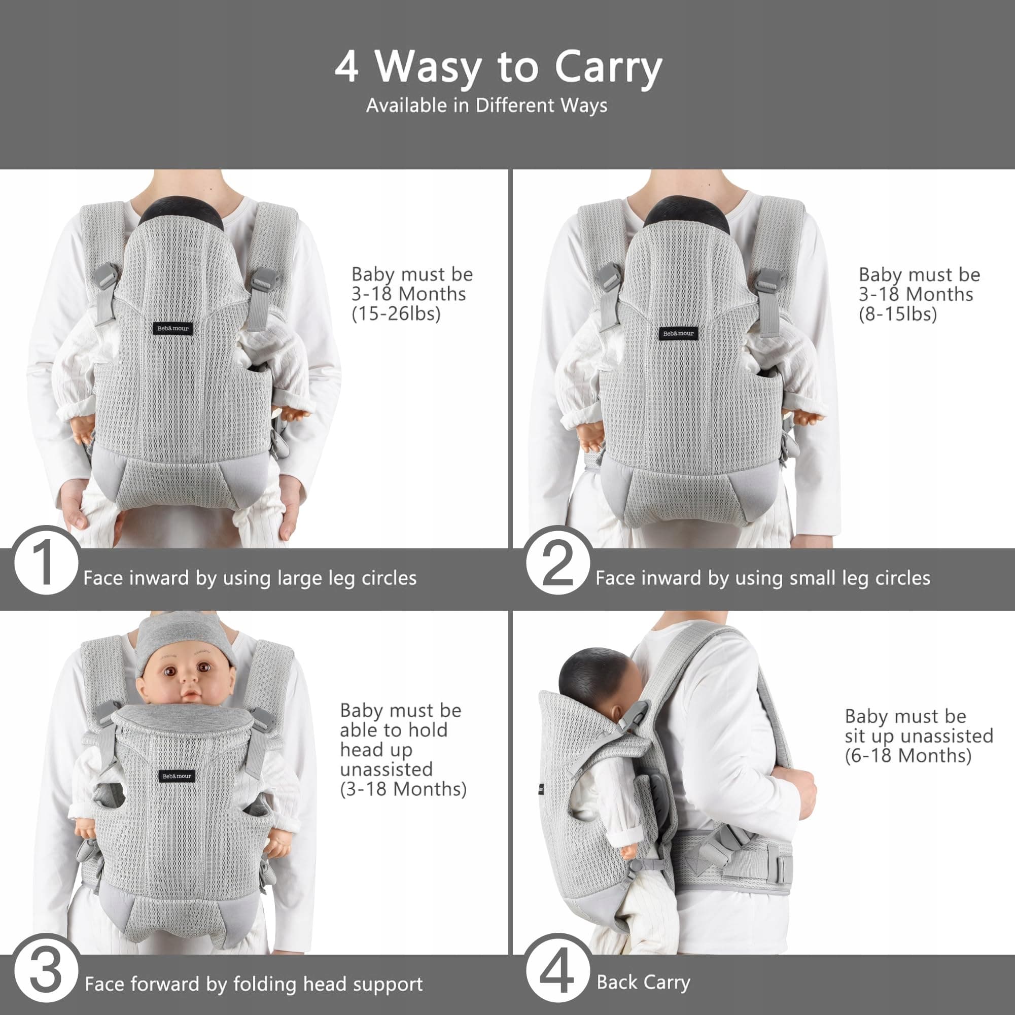 [Pozycje noszenia] Plecak nosidełko Bebamour można przekształcać w pozycje z widokiem do wewnątrz i na zewnątrz dla dzieci w wieku od 3 do 18 miesięcy i o wadze nieprzekraczającej 12 kg
