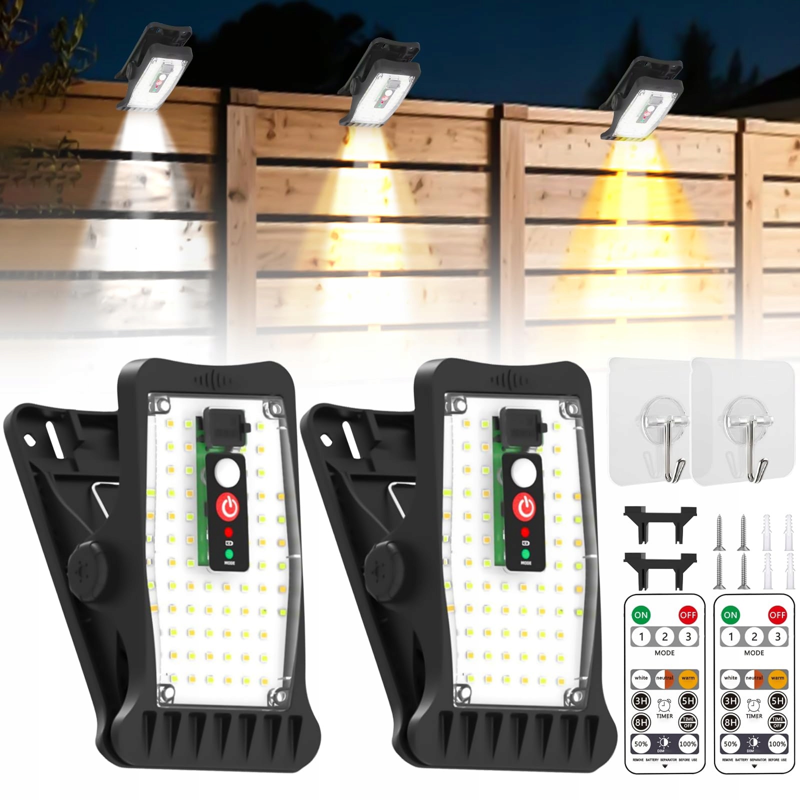 【Zawartość produktu】Otrzymujesz 2 sztuki lamp solarnych na zewnątrz, 1 pilot, 1 x kabel USB do ładowania, 2 x śruby, 2 x kołki rozporowe, 2 x haczyki samoprzylepne, 1 x uchwyt. Odporność na wodę i wysoką temperaturę sprawia, że te lampy solarne z klipsem są w stanie wytrzymać większość warunków pogodowych