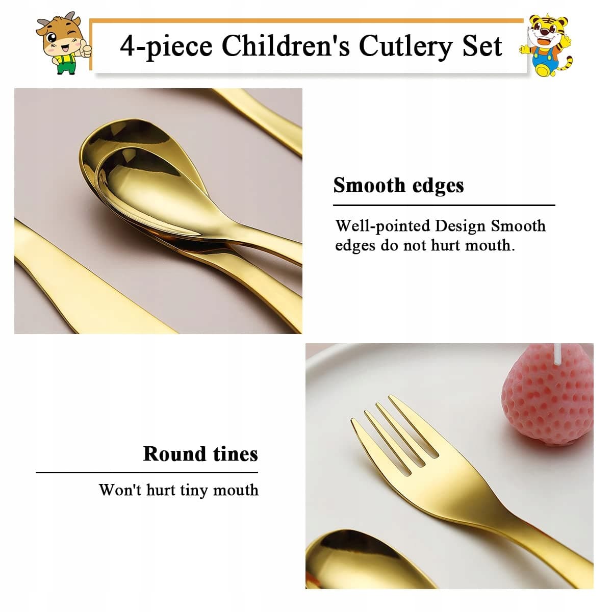 Berglander Gold Zestaw sztućców dziecięcych 4-częściowy z tytanowym pozłacaniem, zestaw naczyń dziecięcych, bezpieczny widelec i łyżka dla dzieci, płaskie naczynia, wysoko polerowane, gładkie zaokrąglone krawędzie, bezpieczne do mycia w zmywarce