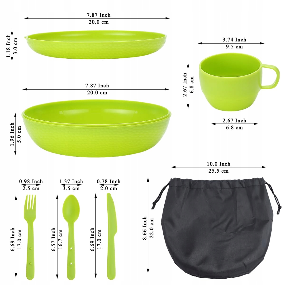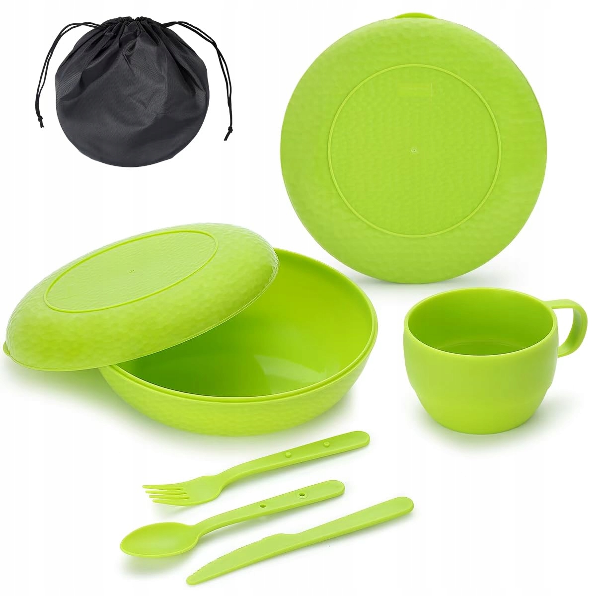 Zestaw sztućców Berglander Camping z miską, talerzem, kubkiem, łyżką, widelcem, nożem i torbą do przenoszenia, oszczędzający miejsce, niezbędne przybory kempingowe z tworzywa sztucznego na podróże, piknik (zielony)