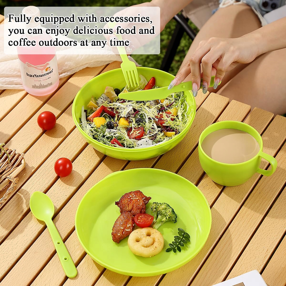 5. Trwała i solidna konstrukcja: Nasze naczynia kempingowe zostały zaprojektowane do intensywnego użytkowania na zewnątrz i są trwałe. Materiał z tworzywa sztucznego jest odporny na zarysowania, pęknięcia i złamania, dzięki czemu posłuży Ci przez wiele sezonów kempingowych. Zainwestuj w ten trwały zestaw i pożegnaj się z ciągłą wymianą naczyń outdoorowych.