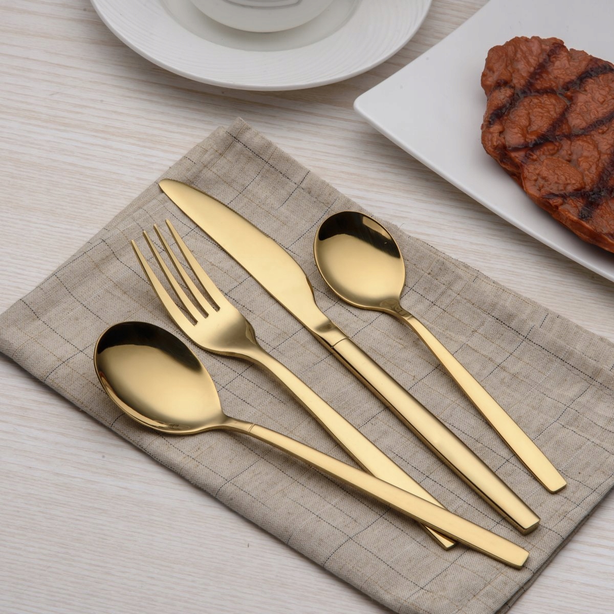 Wysokiej jakości powłoka próżniowa tytanowo-złota o wysokiej temperaturze, zwiększa twardość powierzchni, zapobiega zarysowaniom na sztućcach podczas użytkowania. Idealny do codziennego użytku, świątecznych obiadów, imprez, wesel, restauracji, hoteli lub innych formalnych okazji.