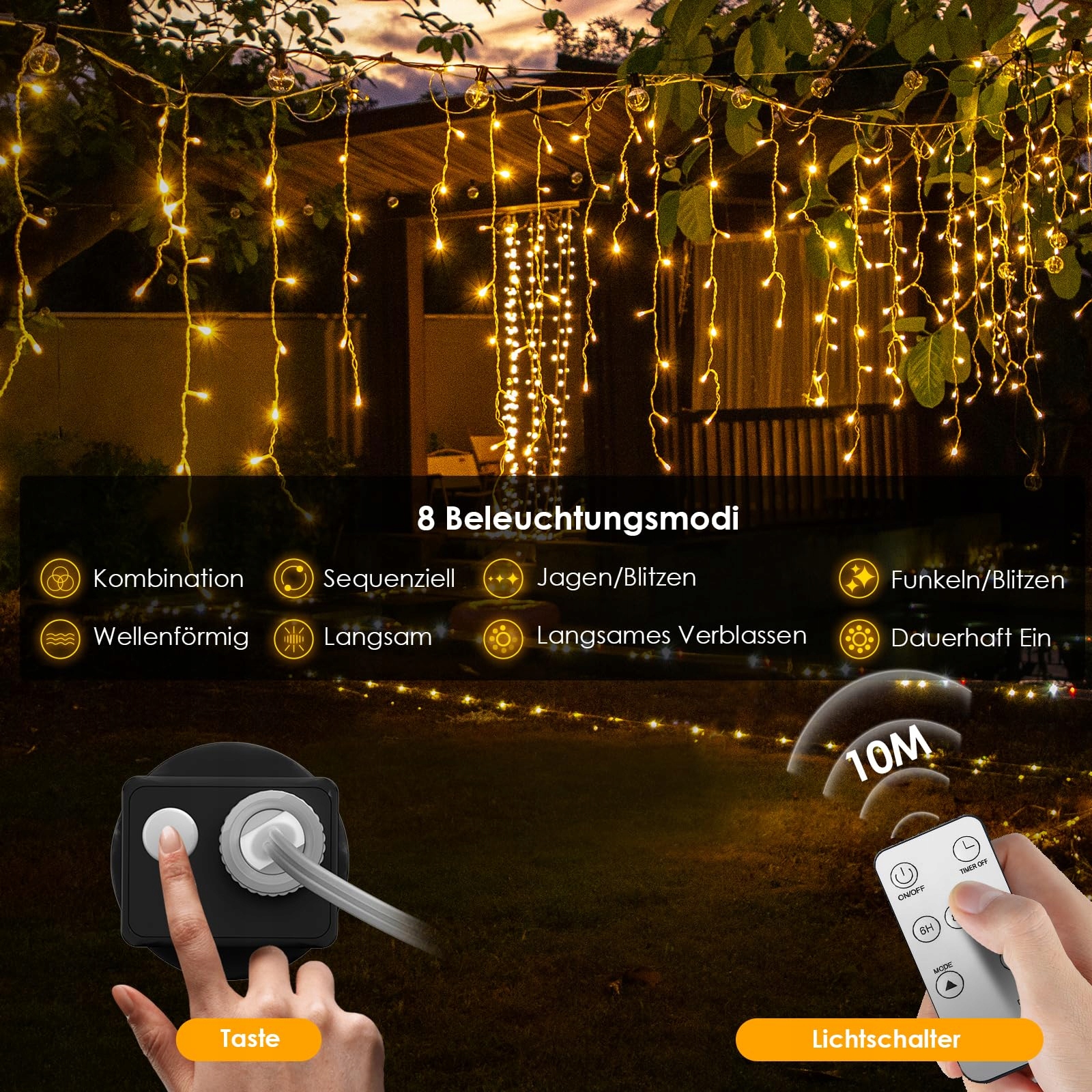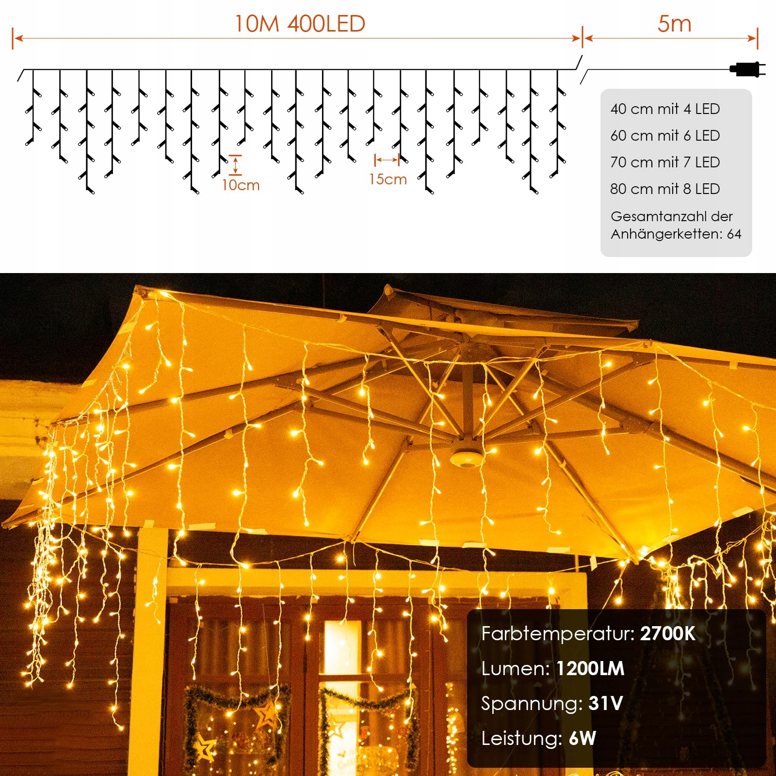 BESCOST Girlanda świetlna Lodowy deszcz na zewnątrz, 10M 400 LED kurtyna świetlna z pilotem i wtyczką, wodoodporna 8 trybów do użytku na zewnątrz i wewnątrz, ogród na zewnątrz balkon wesele impreza, ciepła biel