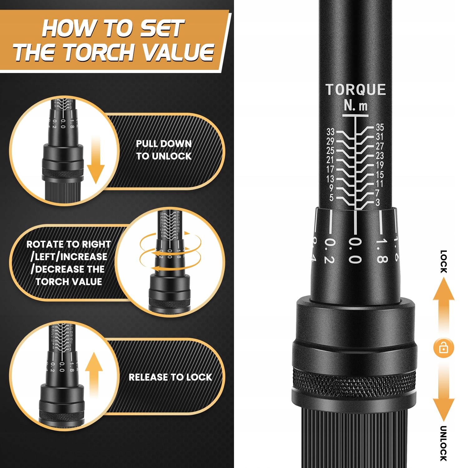 ŁATWY W UŻYCIU: 72-zębowy klucz zapadkowy z dwukierunkowym ustawieniem zgodnie z ruchem wskazówek zegara i przeciwnie do ruchu wskazówek zegara. Klucz dynamometryczny wyposażony jest w przycisk szybkiego blokowania do łatwej instalacji i demontażu nasadek. Ustawianie wartości momentu obrotowego - w celu zablokowania nacisnąć, ustawić wartość momentu obrotowego, zwolnić, aby zablokować wartość momentu obrotowego. Gdy regulowany klucz dynamometryczny osiągnie ustawioną wartość momentu obrotowego, klucz wydaje 'klikający' dźwięk, aby przypomnieć Ci o zaprzestaniu aplikacji siły, aby nie uszkodzić przedmiotu zbyt dużym momentem obrotowym.