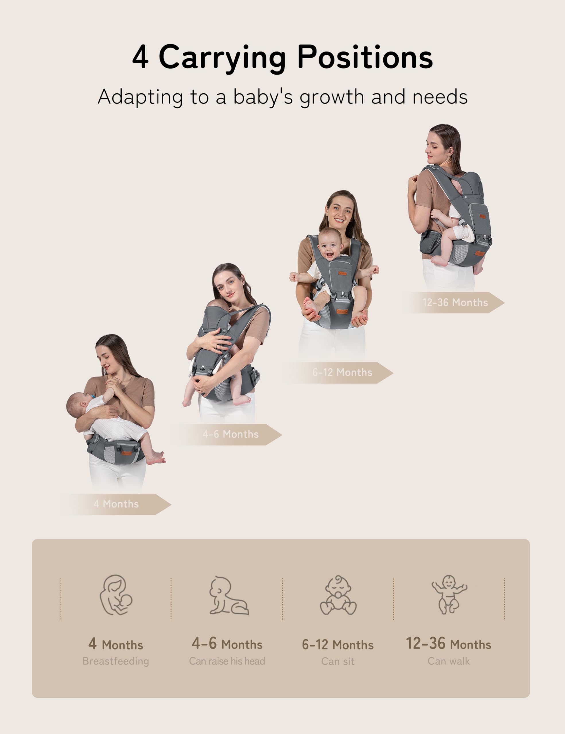 [Wszechstronne pozycjonowanie dziecka]- Dzięki regulowanym pozycjom noszenia, nasze nosidełko doskonale dostosowuje się do rosnącego dziecka, co czyni je idealnym wyborem od noworodka do etapu przedszkolaka. Niezależnie od tego, czy wasze dziecko woli patrzeć do wewnątrz, na zewnątrz, czy być noszone na plecach, nasze nosidełko oferuje wszystko.