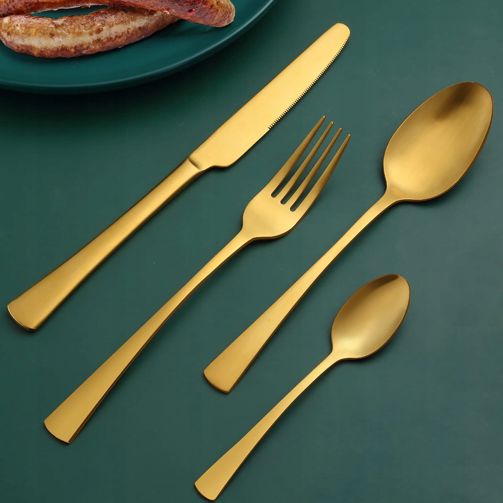 【Doskonałe rzemiosło】Zestaw sztućców ze stali nierdzewnej wykorzystuje proces galwanizacji próżniowej, który nie łatwo się odbarwia. Ponadto tajemniczy matowy złoty wygląd, który wyróżnia się spośród zwykłych naczyń, tworzy elegancką, szlachetną i luksusową atmosferę podczas posiłków. W codziennym życiu możesz używać zmywarki do czyszczenia, nie martwiąc się o uszkodzenia, co oszczędza dużo czasu.