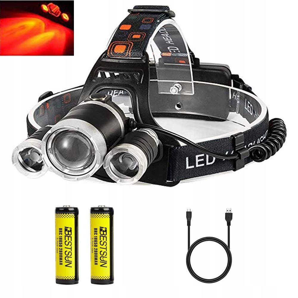 BESTSUN Czołówka led ładowalna światło czerwone outerdo czołówka USB 5000 lumenów latarka do pracy, na kemping, wędkowanie i nocne polowanie (białe i czerwone światło)