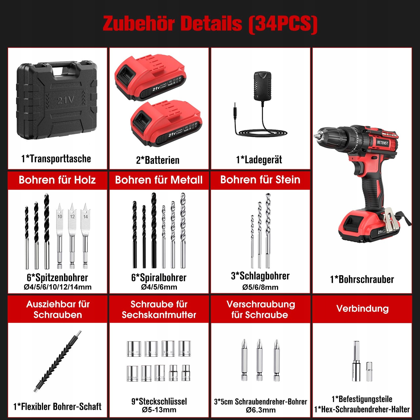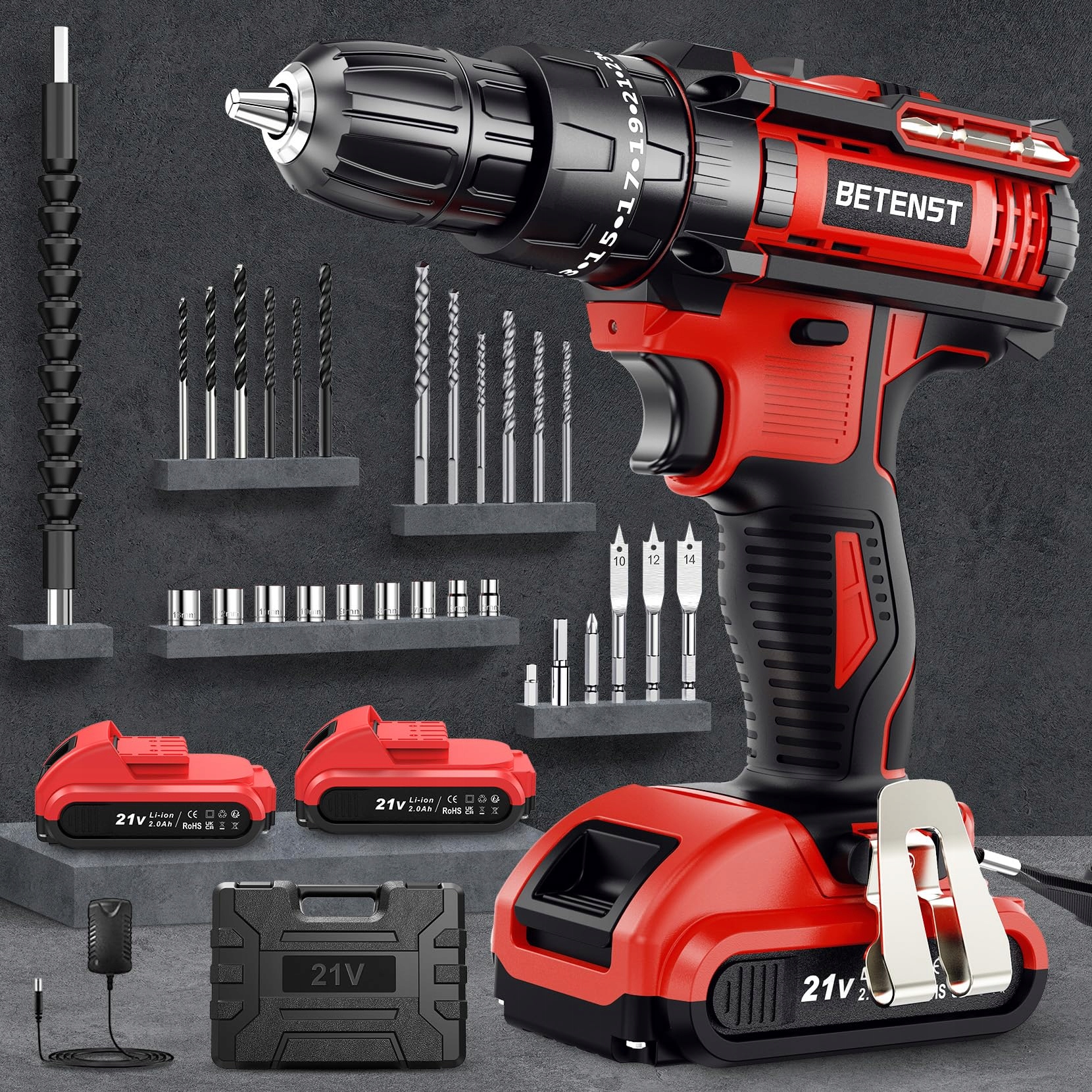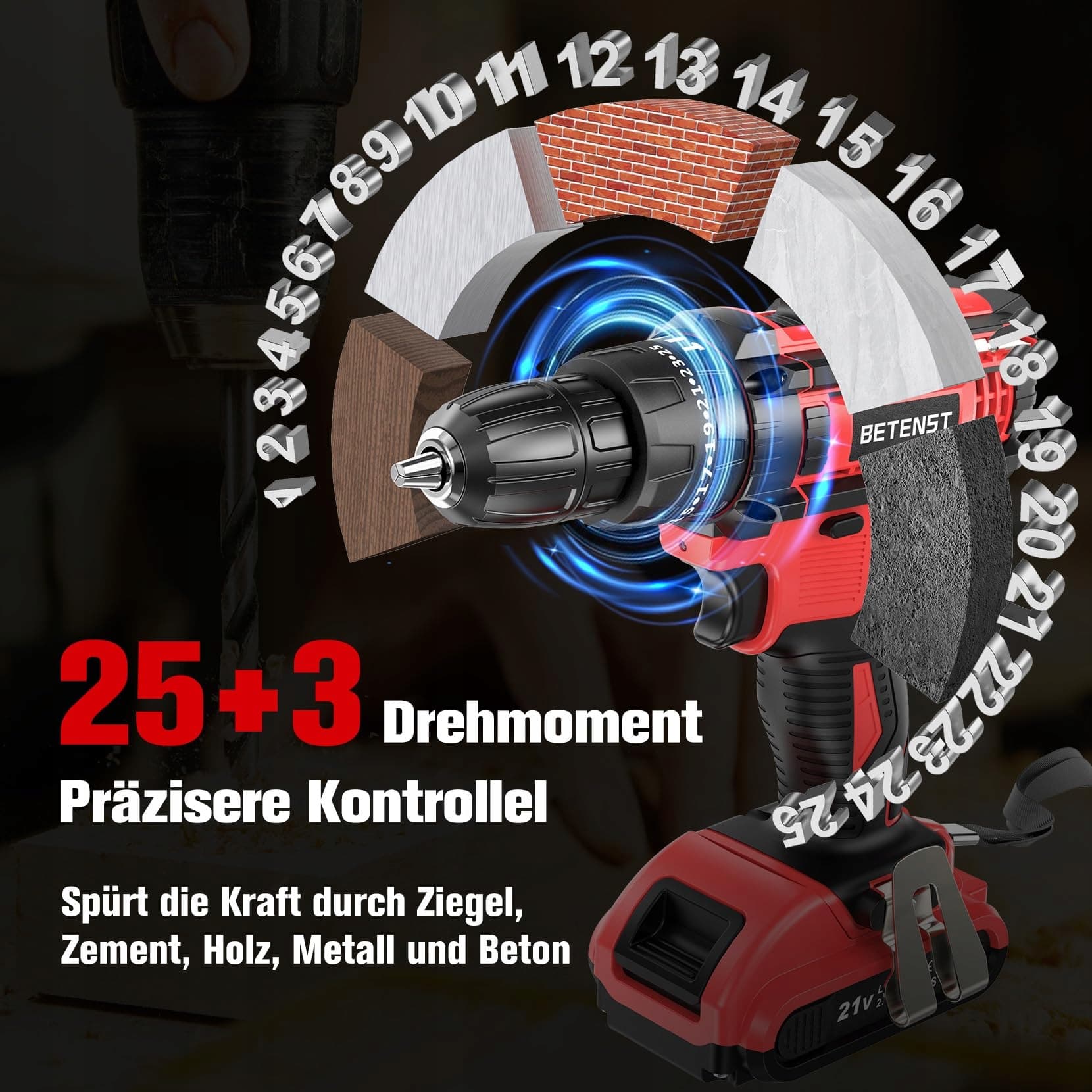 【System 3-w-1 Młotowiertarka & 42N.m Maksymalny moment obrotowy】BETENST Wkrętarka akumulatorowa posiada 3 tryby pracy - wkręcanie, wiercenie i wiercenie udarowe. Z maksymalnym momentem obrotowym 42 Nm, wiertarko-wkrętarka bez problemu wierci otwory i wkręca śruby w drewno, metal i plastik. Wiertarka jest idealnym narzędziem zarówno dla majsterkowiczów, jak i doświadczonych rzemieślników. Nasz zestaw wkrętarki akumulatorowej może spełnić większość Twoich potrzeb związanych z majsterkowaniem.