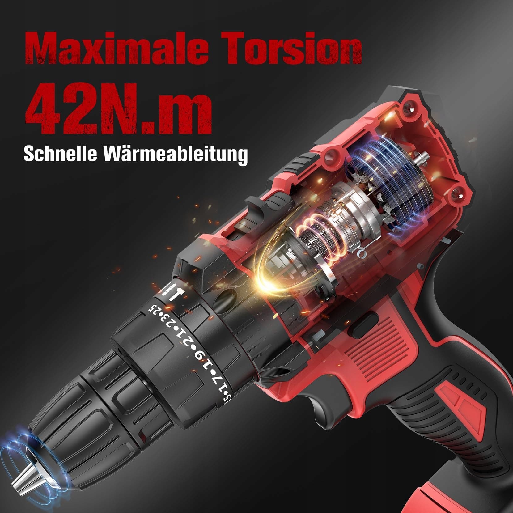 【2 prędkości i 25 poziomów momentu obrotowego】 Nasza wiertarka akumulatorowa może być ustawiona do pracy w dwóch różnych zakresach prędkości (0–550 obr/min, 0–1850 obr/min), dzięki czemu zawsze masz moc, której potrzebujesz. Ponadto, wkrętarka udarowa akumulatorowa posiada 25 pozycji momentu obrotowego do wyboru uchwytu wiertarskiego, co umożliwia bardziej precyzyjną pracę podczas wiercenia i wkręcania.