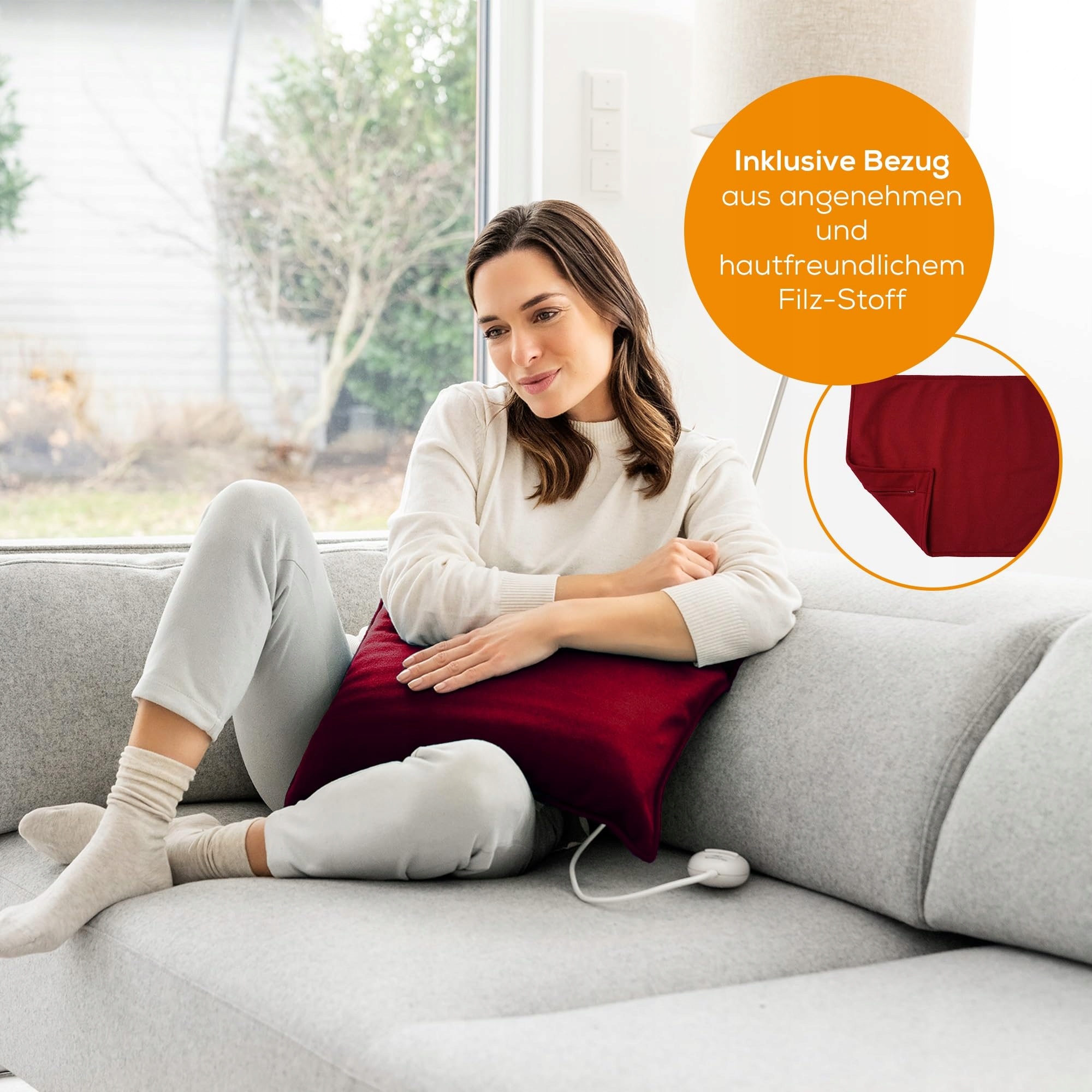 SZCZEGÓLNIE MIĘKKA: Materiał wierzchni poduszki grzewczej jest szczególnie oddychający, przyjemny w dotyku i przyjazny dla skóry; dzięki powłoce filcowej poduszka zyskuje indywidualny wygląd, który pasuje do twojego gustu - użyte tekstylia spełniają wymagania standardu Öko-Tex 100