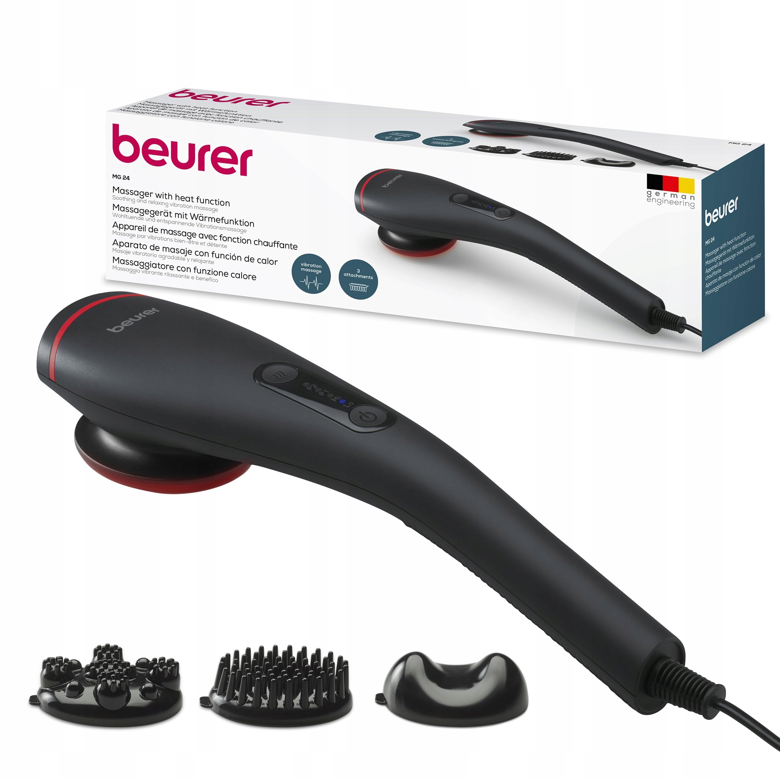 Beurer MG 24 Urządzenie do masażu wibracyjnego, 2 relaksujące programy masażu i 2 poziomy intensywności dla idealnego relaksu, 3 końcówki do masażu, do użytku na całym ciele, czarne