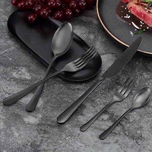 【Zdrowie i trwałość】Matowy czarny zestaw sztućców jest wykonany z wysokiej jakości, bezpiecznej dla żywności stali nierdzewnej kutej z jednego kawałka, zapewniając zdrowie i trwałość, nietoksyczny, bez niklu, odporny na korozję.