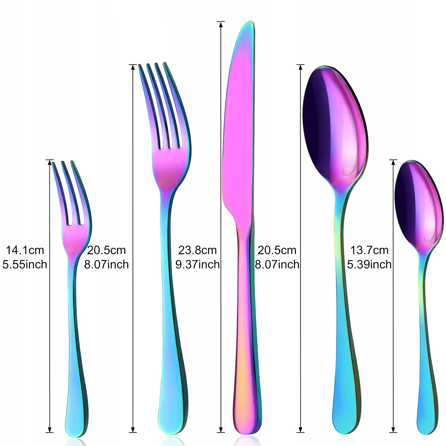 【Zdrowie i trwałość】Tęczowy zestaw sztućców wykonany jest z wysokiej jakości stali nierdzewnej spożywczej, kutej z jednego kawałka, co zapewnia zdrowie i trwałość, jest nietoksyczny, wolny od niklu, odporny na korozję.