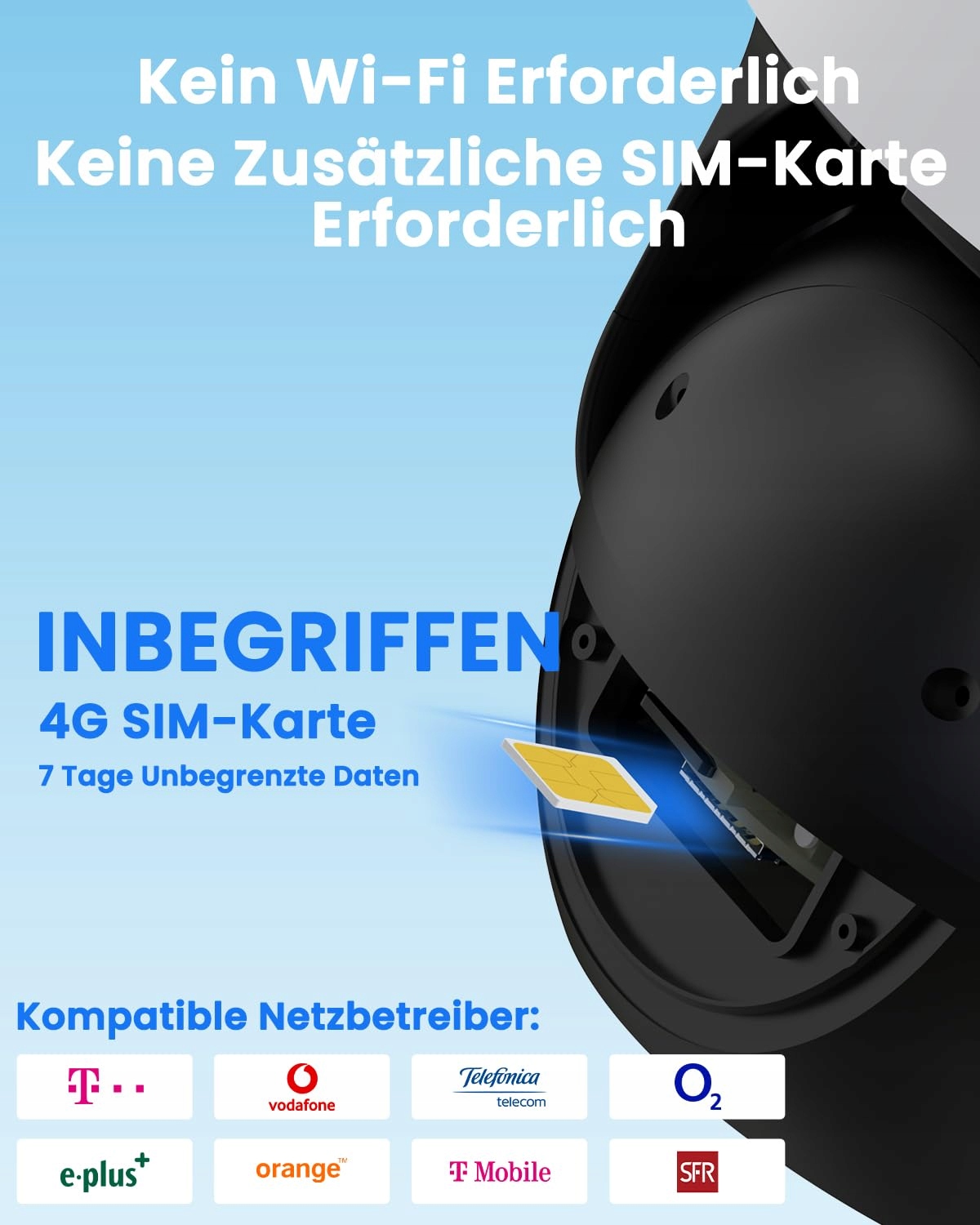 【Plug & Play z 4G-SIM】Zewnętrzna kamera 4G jest dostarczana z kartą SIM 4G oferującą 7 dni nieograniczonych danych. Wystarczy ją włożyć, sparować z aplikacją i natychmiast rozpocząć monitoring. Po okresie testowym możesz wygodnie wybrać niedrogi plan w aplikacji lub użyć własnej karty SIM 4G od jednego z dużych operatorów.