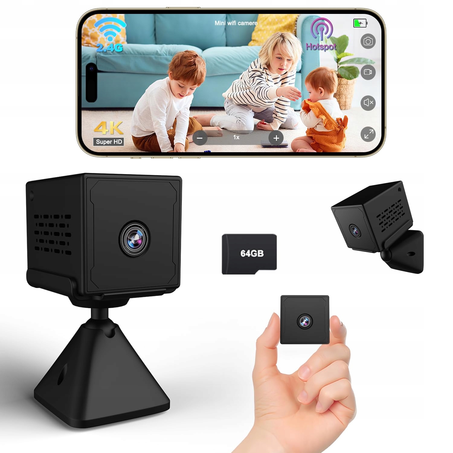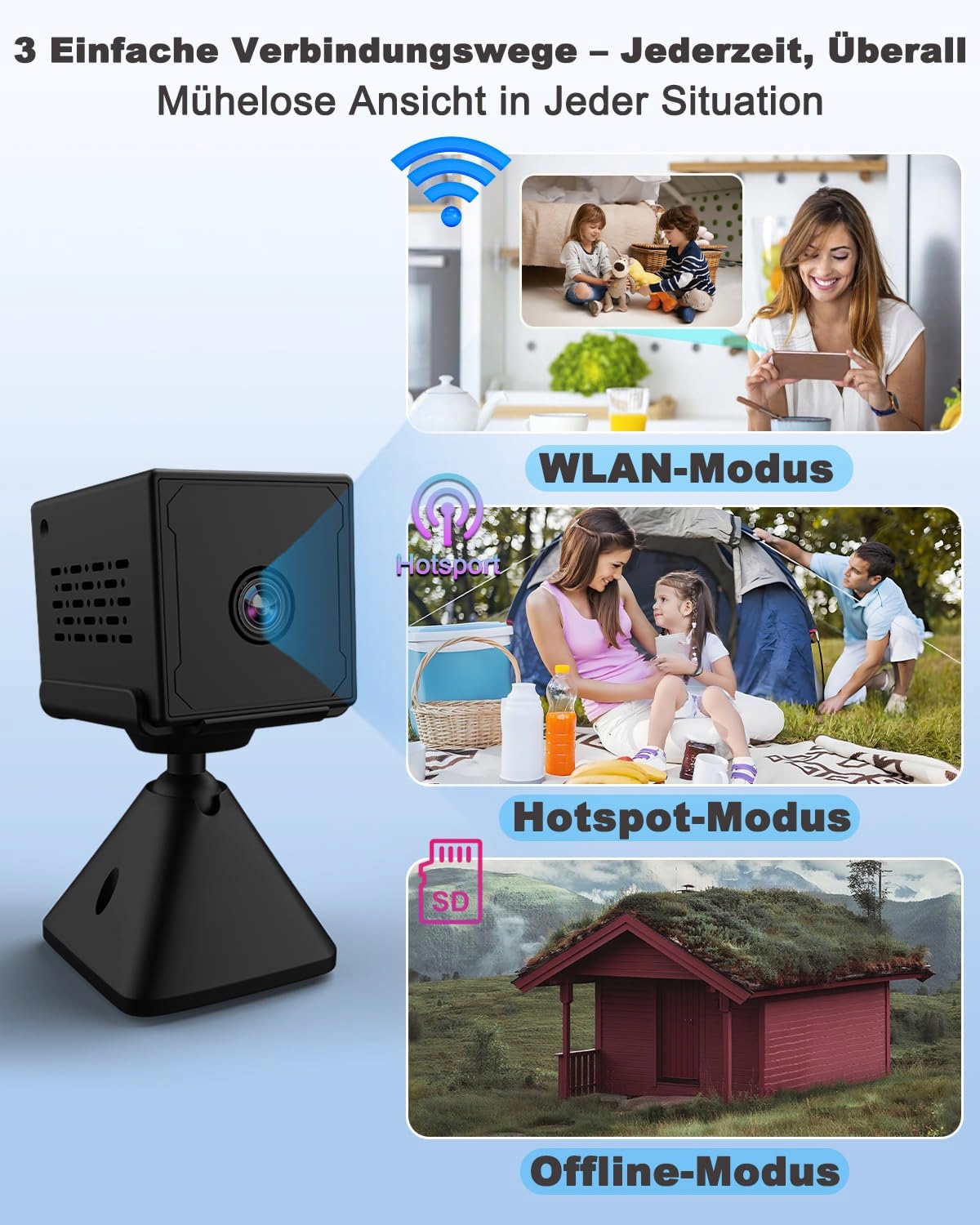【Trzy tryby połączenia – WLAN, Hotspot i lokalna pamięć】 Ta mini kamera jest bardziej wszechstronna niż inne modele: połącz ją przez 2.4G WLAN do użytku wewnątrz, korzystaj z trybu Hotspot bez WLAN lub wygodnie zapisuj dane na wbudowanej karcie 64GB. Dzięki temu kamera do monitoringu wewnętrznego pozostaje elastyczna i niezawodna nawet bez internetu – idealna na każdą sytuację.