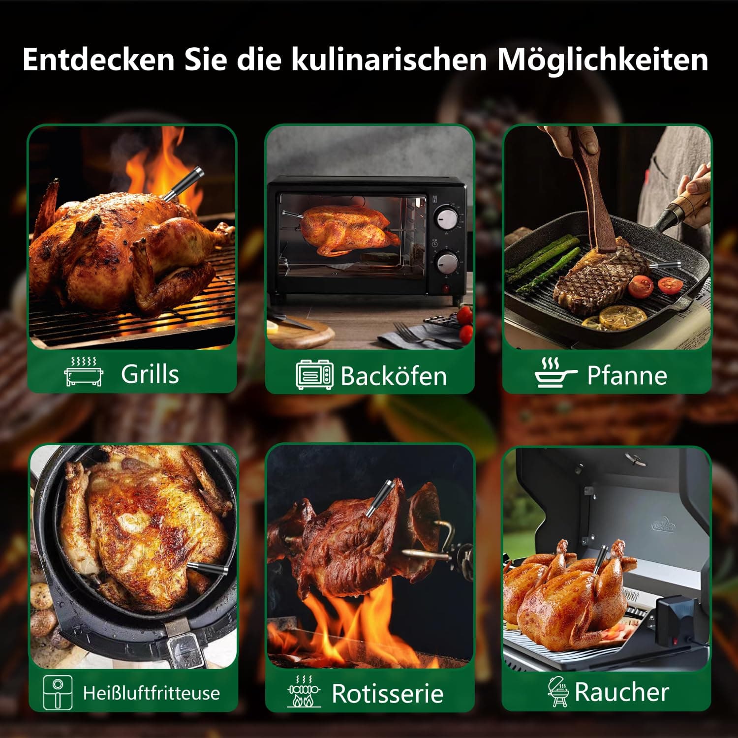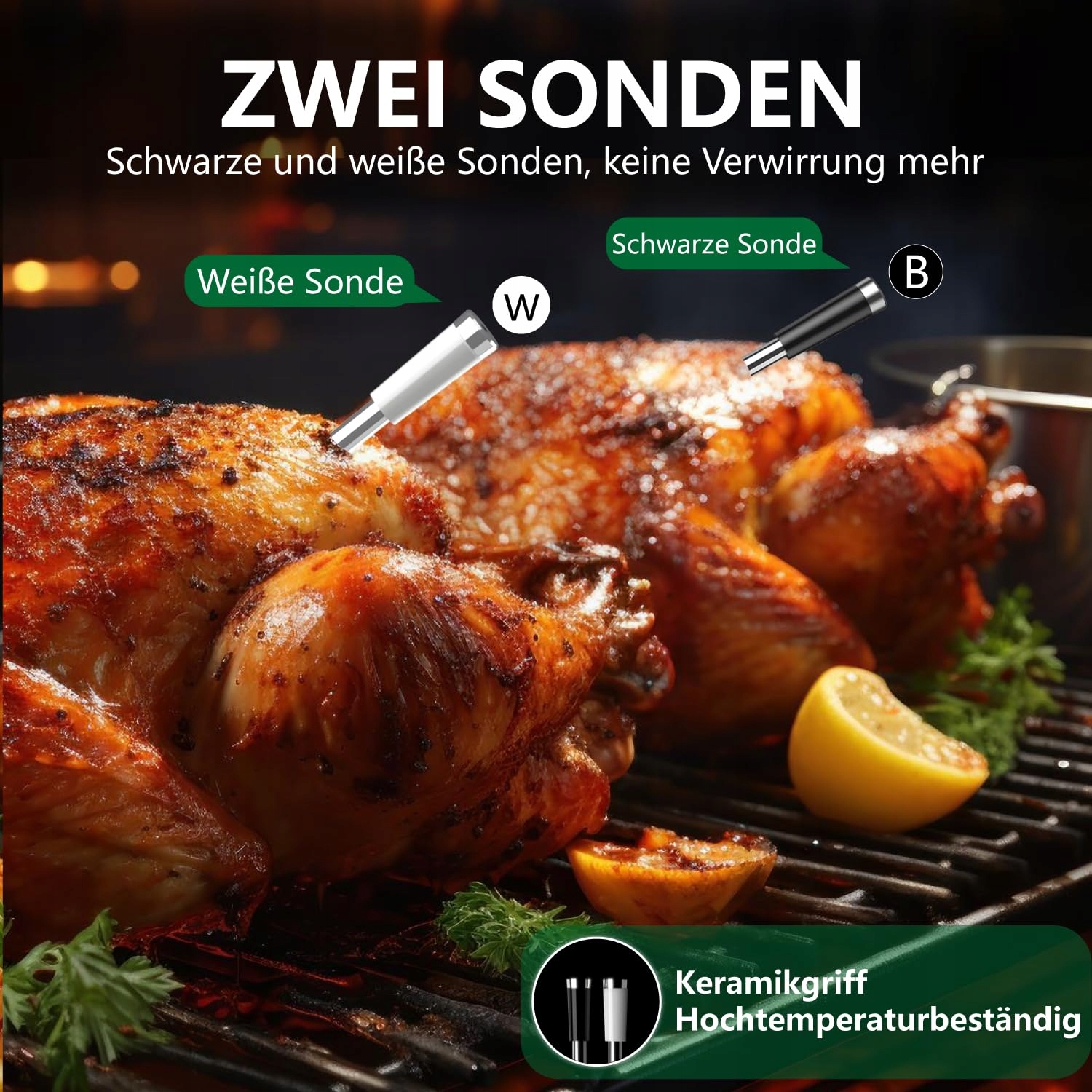 Ten termometr do mięsa jest dostarczany z dwiema czarnymi i białymi bezprzewodowymi sondami, aby szybciej śledzić postęp gotowania różnych potraw i zaoszczędzić czas. Nie jest w stanie mierzyć temperatury otoczenia.