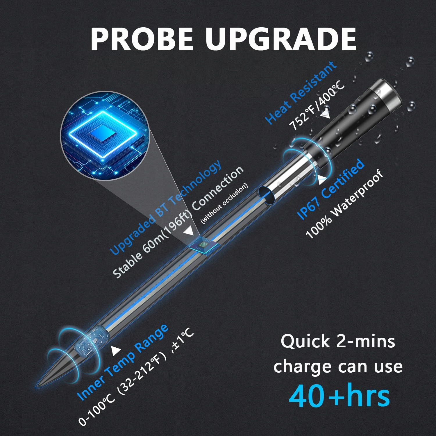 NOWO ZAAWANSOWANA bezprzewodowa sonda: Ten bezprzewodowy termometr do mięsa do grillowania i wędzenia jest wyposażony w 100% bezprzewodową sondę do mięsa, czas reakcji 1-2 sekundy, wodoodporny, można go myć pod bieżącą wodą lub wkładać do zmywarki, jest niezawodnym towarzyszem w Twojej kuchni.