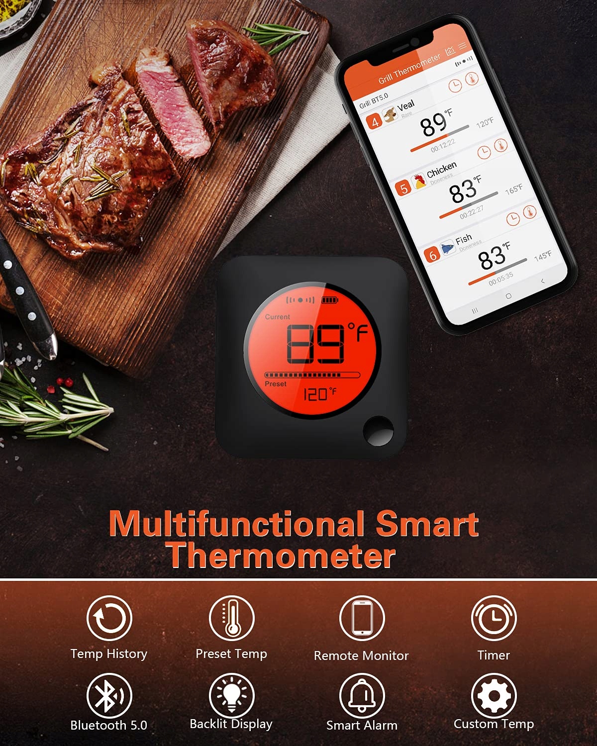 Precyzyjny i wszechstronny: Nasze czujniki jakości żywności mierzą w zakresie od 32°F do 572°F z dokładnością ±1,8°F/1°C i umożliwiają jednoczesne monitorowanie wielu temperatur żywności. Są idealne do wędzenia, grillowania, BBQ i pieczenia.