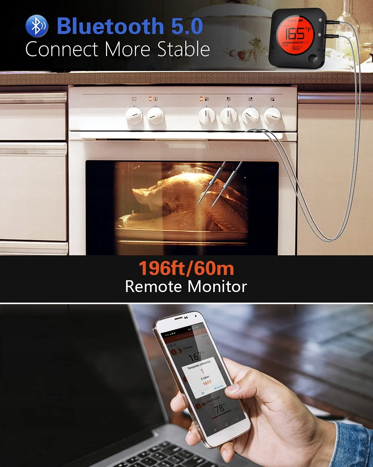 100 metrów zasięgu Bluetooth: Ten bezprzewodowy termometr do mięsa wykorzystuje zaawansowaną technologię Bluetooth 5.0 do silnego i skutecznego połączenia. Musisz tylko ustawić termometr do grilla obok rusztu lub piekarnika i w każdej chwili sprawdzić temperaturę mięsa w swoim piekarniku, wędzarni lub piekarniku.