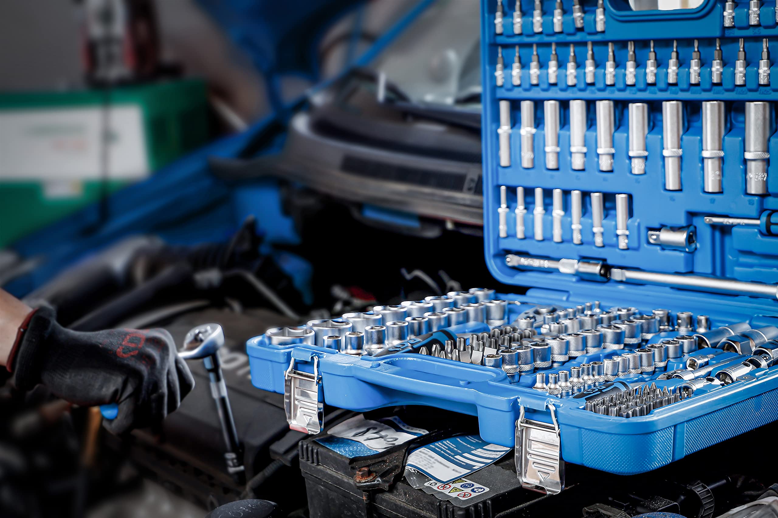Narzędzia z napędem 10 mm (3/8'): 1 klucz przełączający | 1 przedłużacz 125 mm | 1 przegub kardaniczny | 1 klucz do świec zapłonowych SW 18 | 10 nasadek kluczy SW 10 - 11 - 12 - 13 - 14 - 15 - 16 - 17 - 18 - 19 mm | 6 nasadek kluczy, głębokich, SW 10 - 11 - 12 - 13 - 14 - 15 mm | 6 nasadek kluczy E-Profil SW E10 - E11 - E12 - E14 - E16 - E18 | 1 uchwyt bitów dla bitów 8 mm