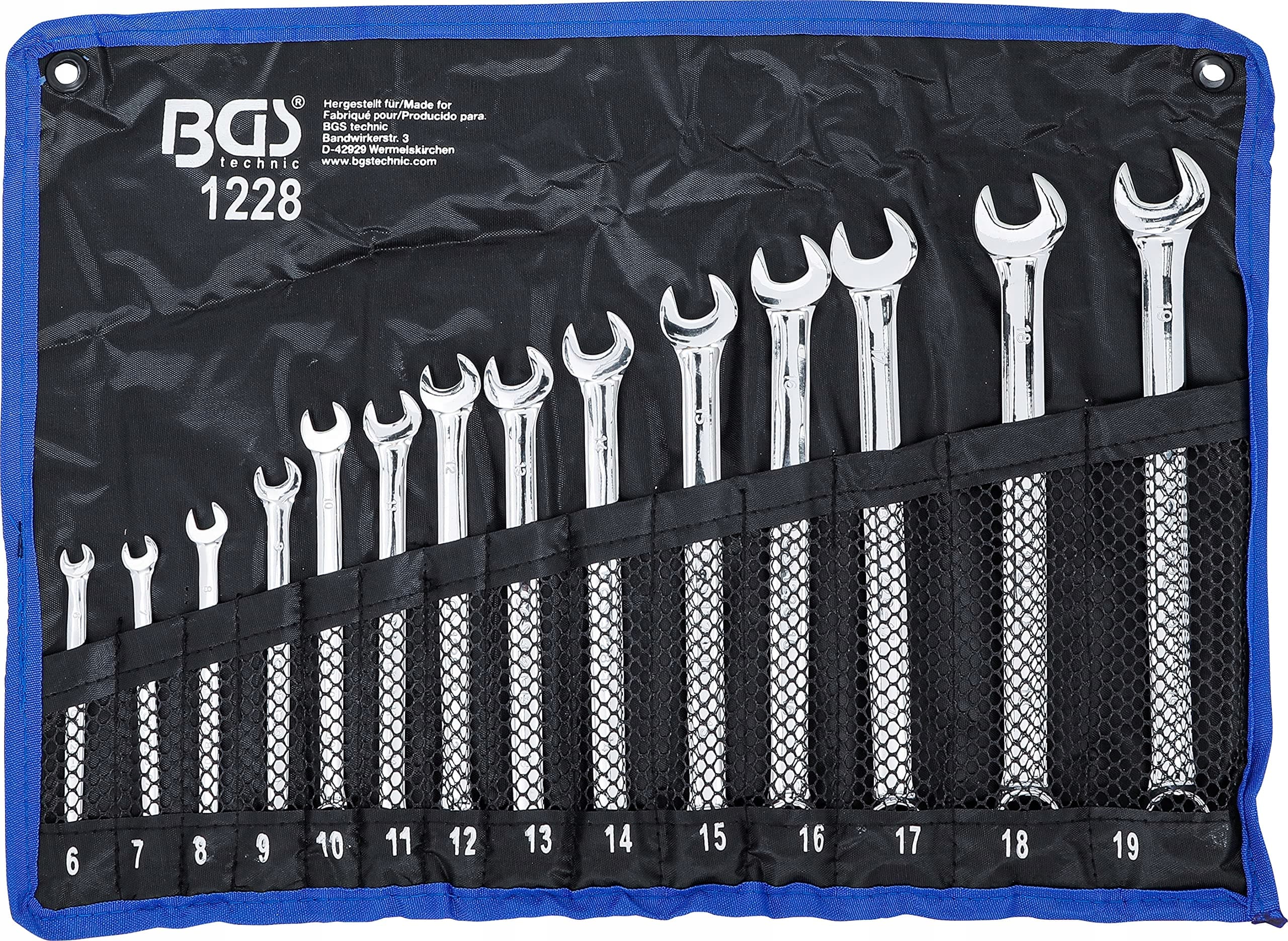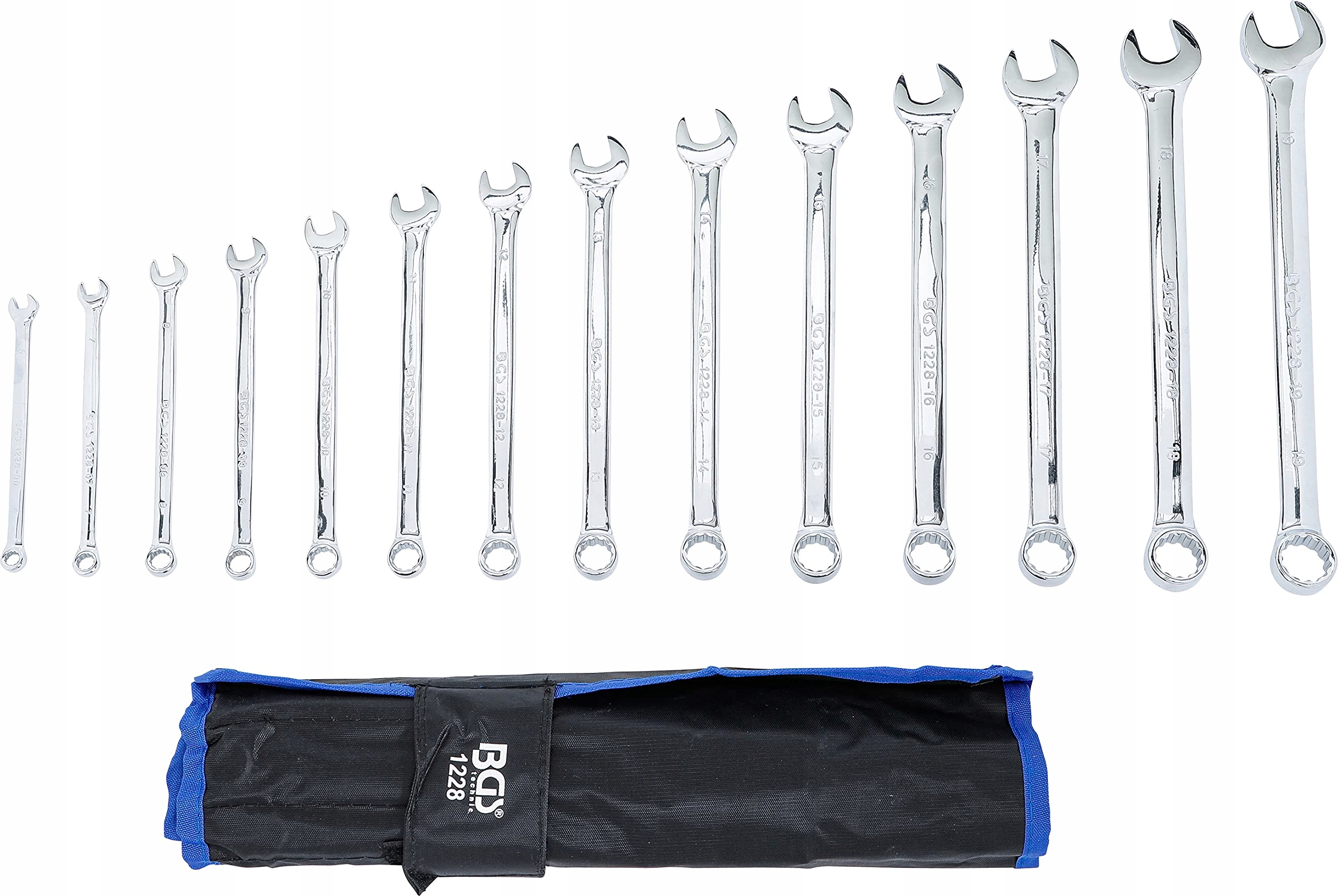 BGS 1228 | Zestaw kluczy płaskich i oczkowych | 14-częściowy | extra długi | SW 6 - 19 mm | w tym torba Tetron | Klucz oczkowy