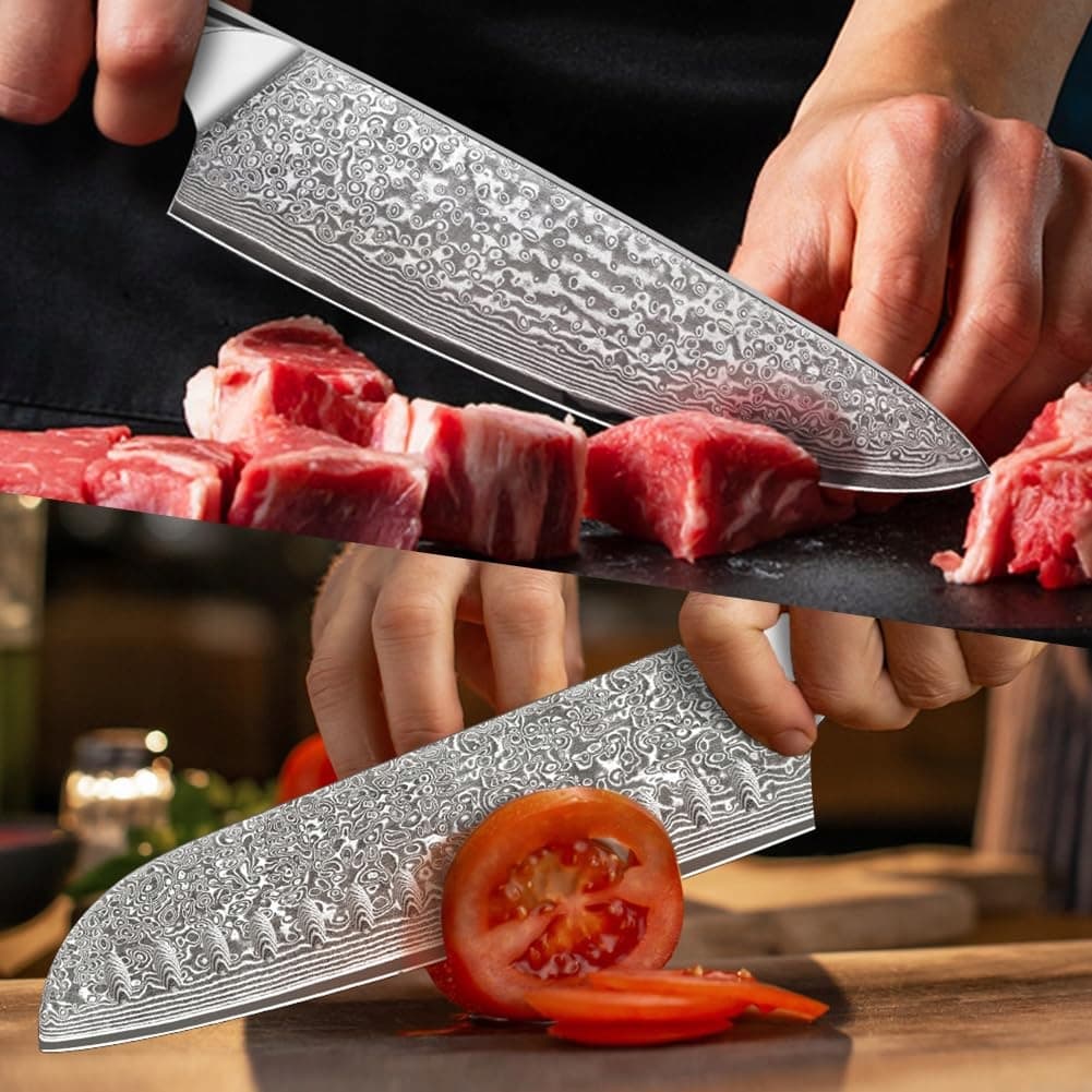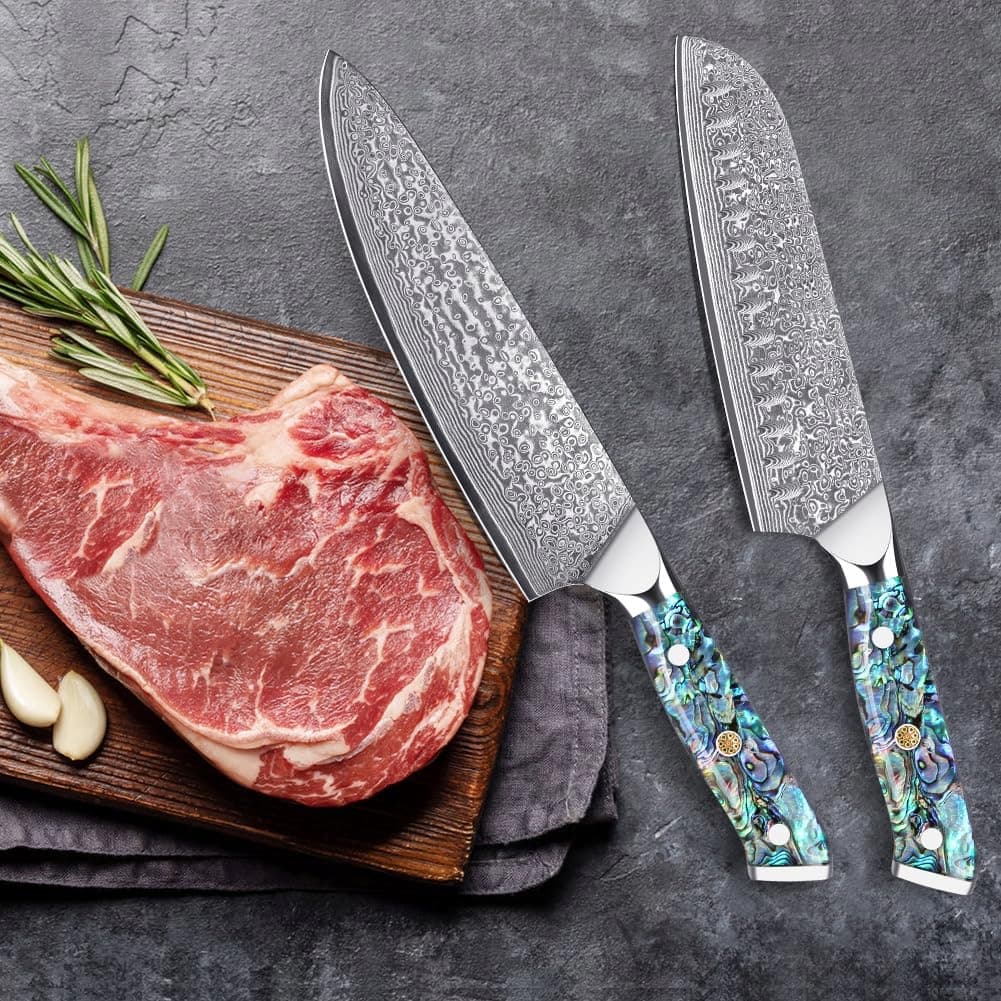 ZESTAW NOŻY DAMASZKOWYCH BILLION DUO, Zestaw noży kuchennych 2-częściowy, 67 warstw stali damasceńskiej, profesjonalny nóż szefa kuchni, nóż santoku z uchwytem z żywicy syntetycznej z płytkami perłowymi