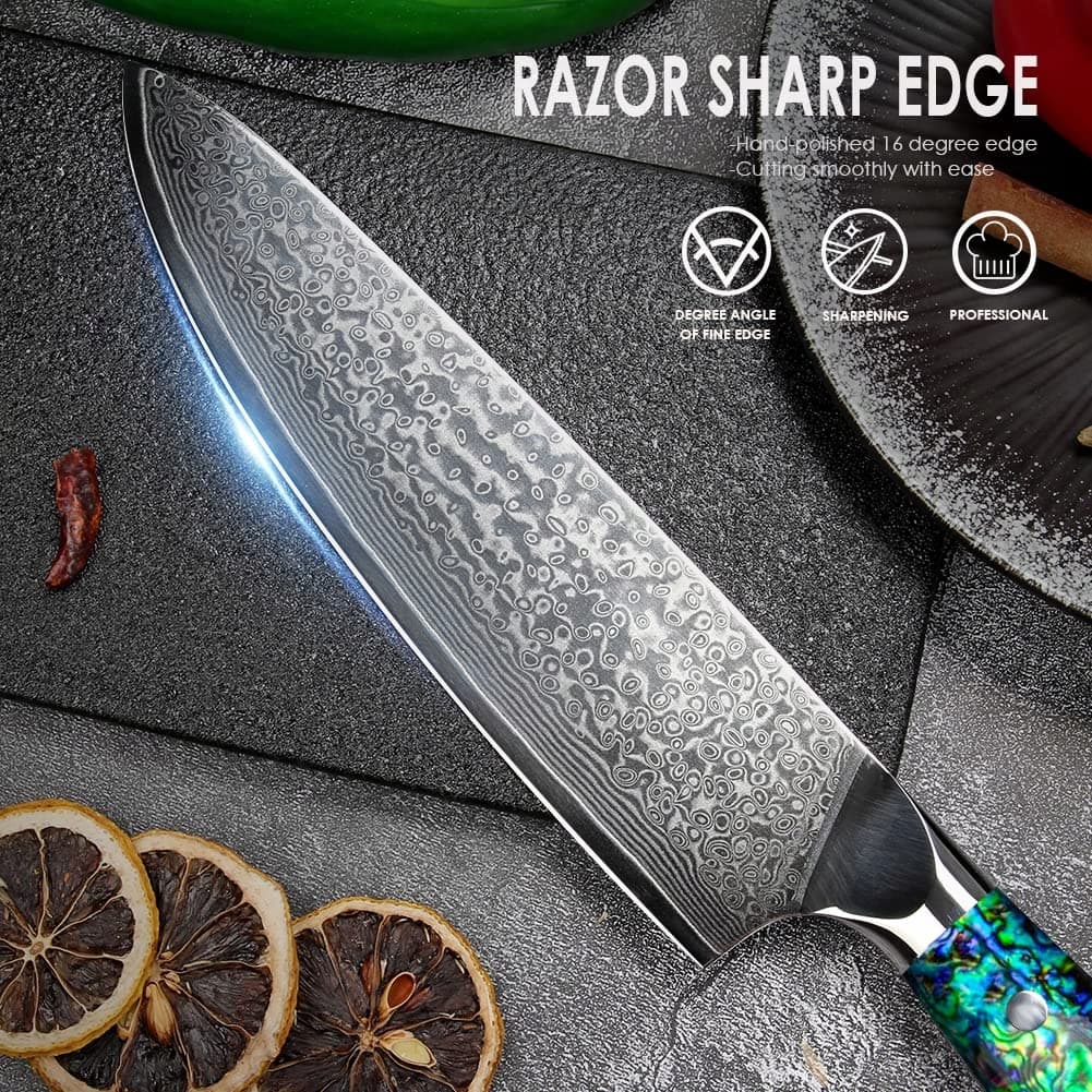 ✅【Płytki perłowe i uchwyt z żywicy syntetycznej】Nasz zestaw noży ma ergonomicznie uformowany uchwyt z pokrytymi żywicą syntetyczną płytkami perłowymi, co zapewnia idealną równowagę i wygodny chwyt. Umożliwia to lepszą kontrolę i pewny chwyt podczas użytkowania, dzięki czemu możesz w pełni wykorzystać potencjał swojego noża damasceńskiego.