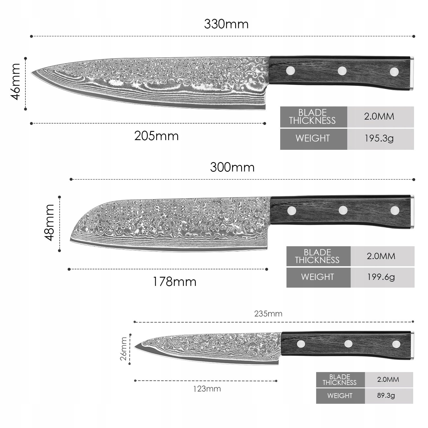 Wszechstronne zastosowanie: Ten zestaw noży kucharskich damasceńskich doskonale nadaje się do krojenia, siekania i kostkowania różnych składników. Niezbędne narzędzie w każdej kuchni.