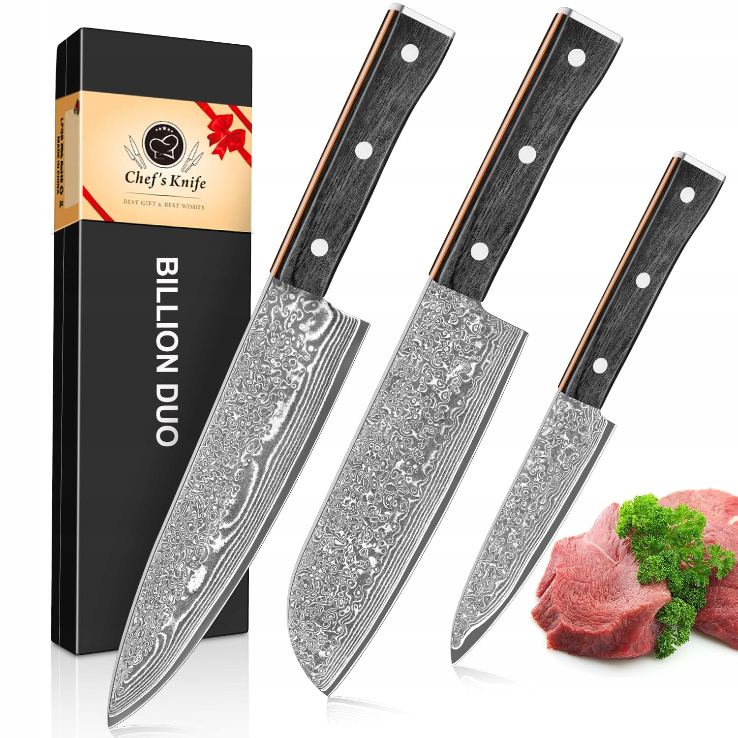 BILLION DUO 3SZT Zestaw noży damasceńskich, 67 warstw VG10 stal damasceńska zestaw noży kuchennych, profesjonalne noże kucharskie, zestaw noży damasceńskich z uchwytem z żywicy - seria D08