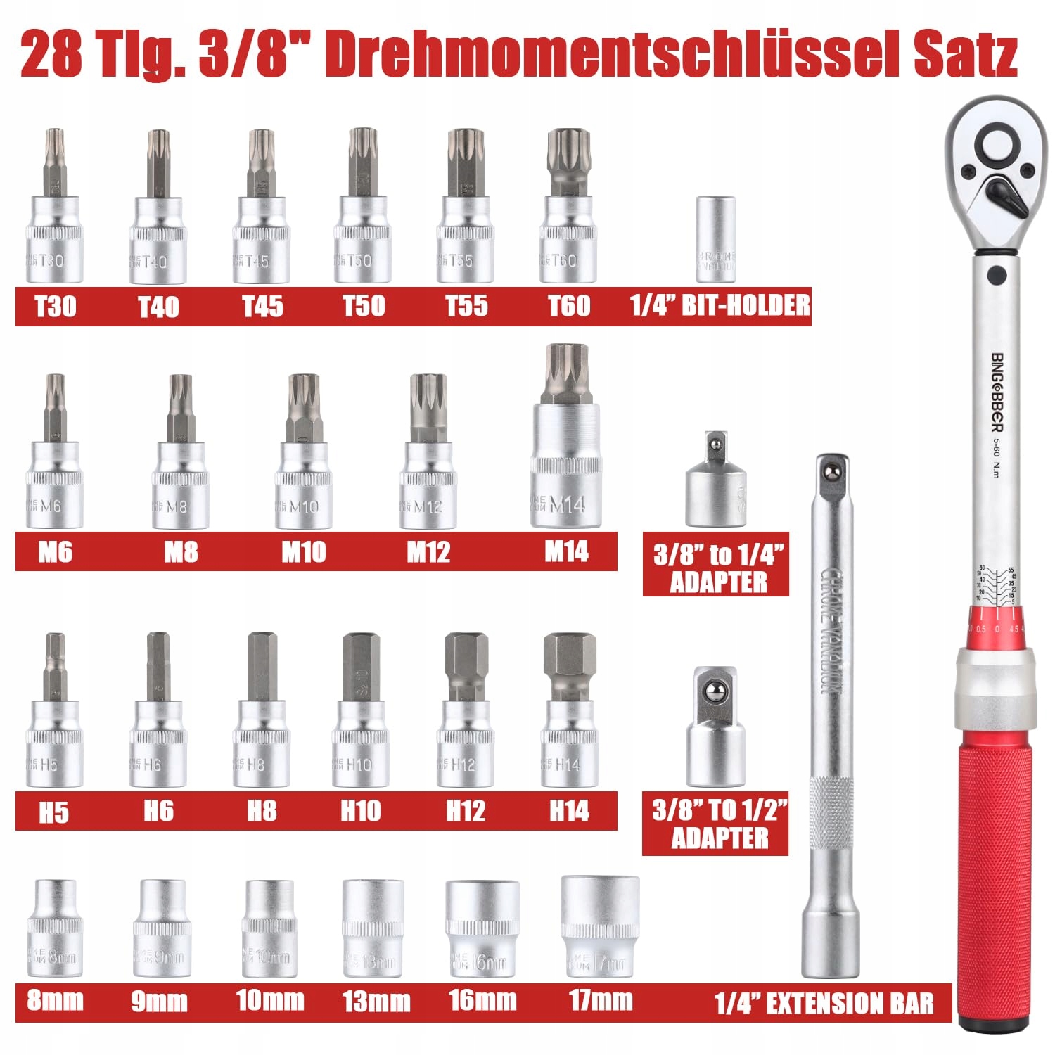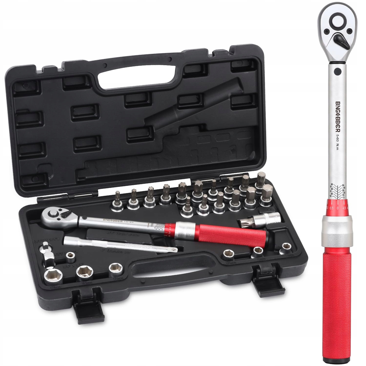 BINGCOBBER klucz dynamometryczny 3/8”,5-60NM klucz dynamometryczny do roweru i motocykla zestaw z dużą ilością akcesoriów, takich jak przedłużacz, bity, wkładki nasadowe, adapter