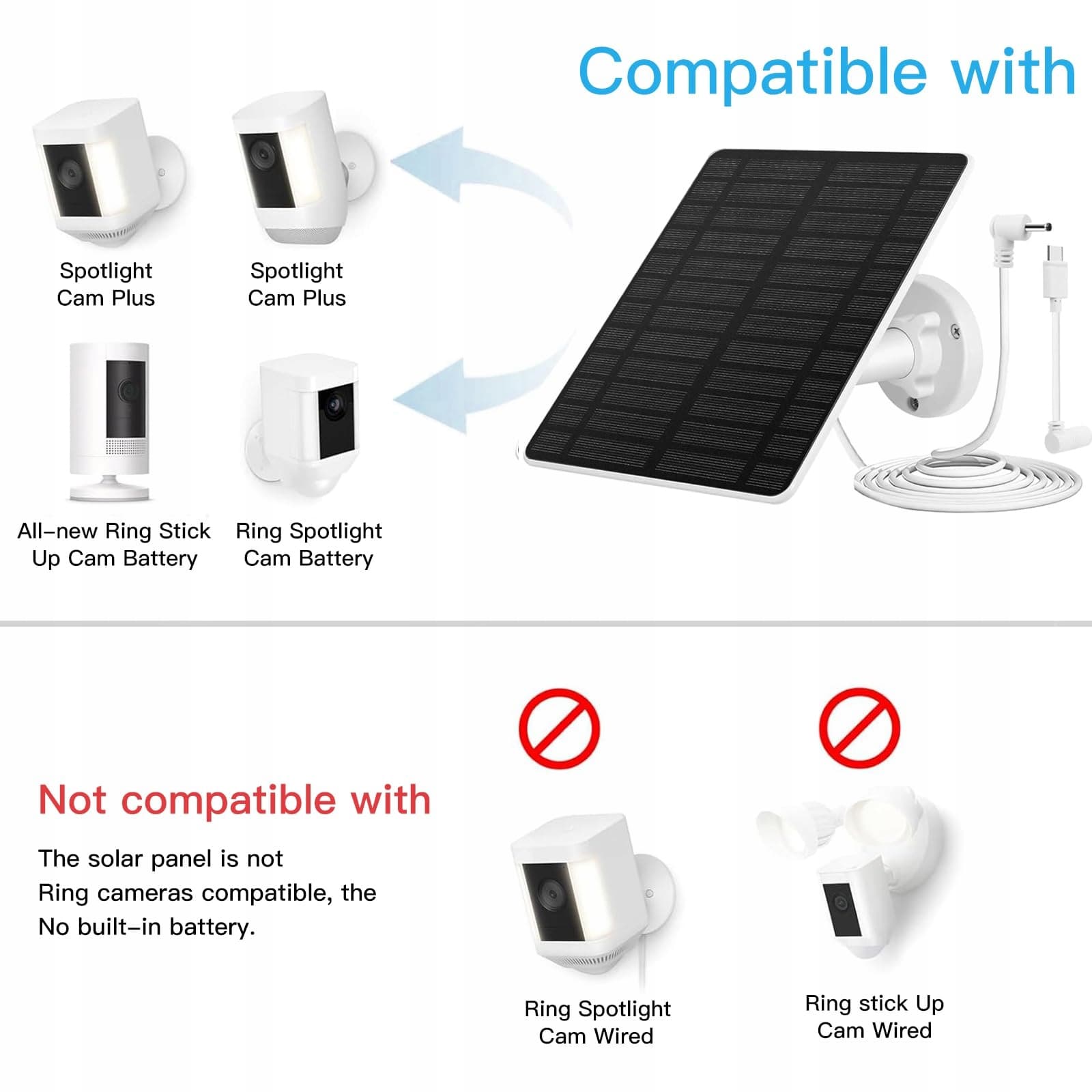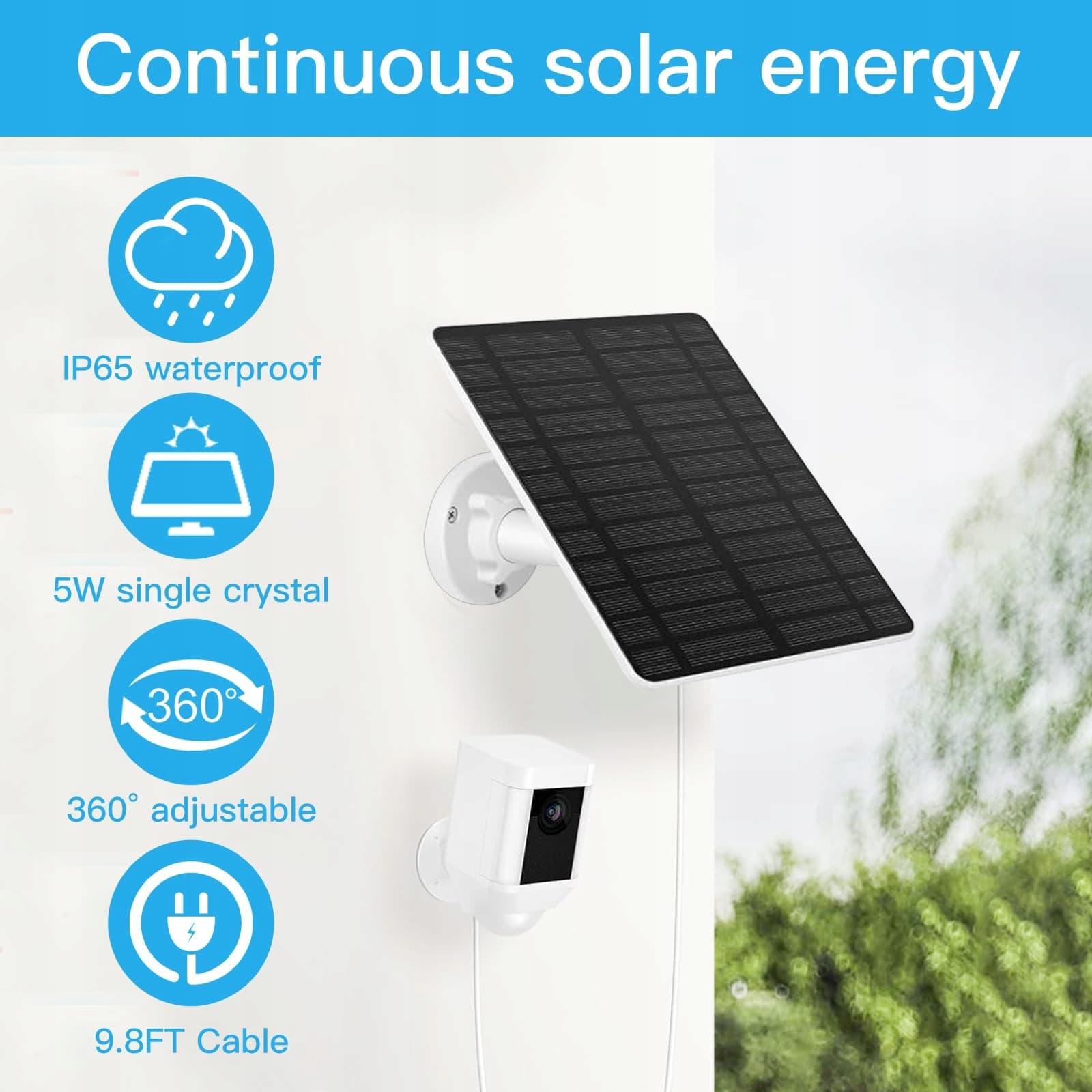 Binnan panel słoneczny do kamery monitoringu zewnętrznego, kompatybilny panel słoneczny 5W do kamery, panel słoneczny do kamery z akumulatorem Solar Doorbell Camera z kablem ładującym 9,8 stopy, wodoodporny IP65, regulowany uchwyt 360°