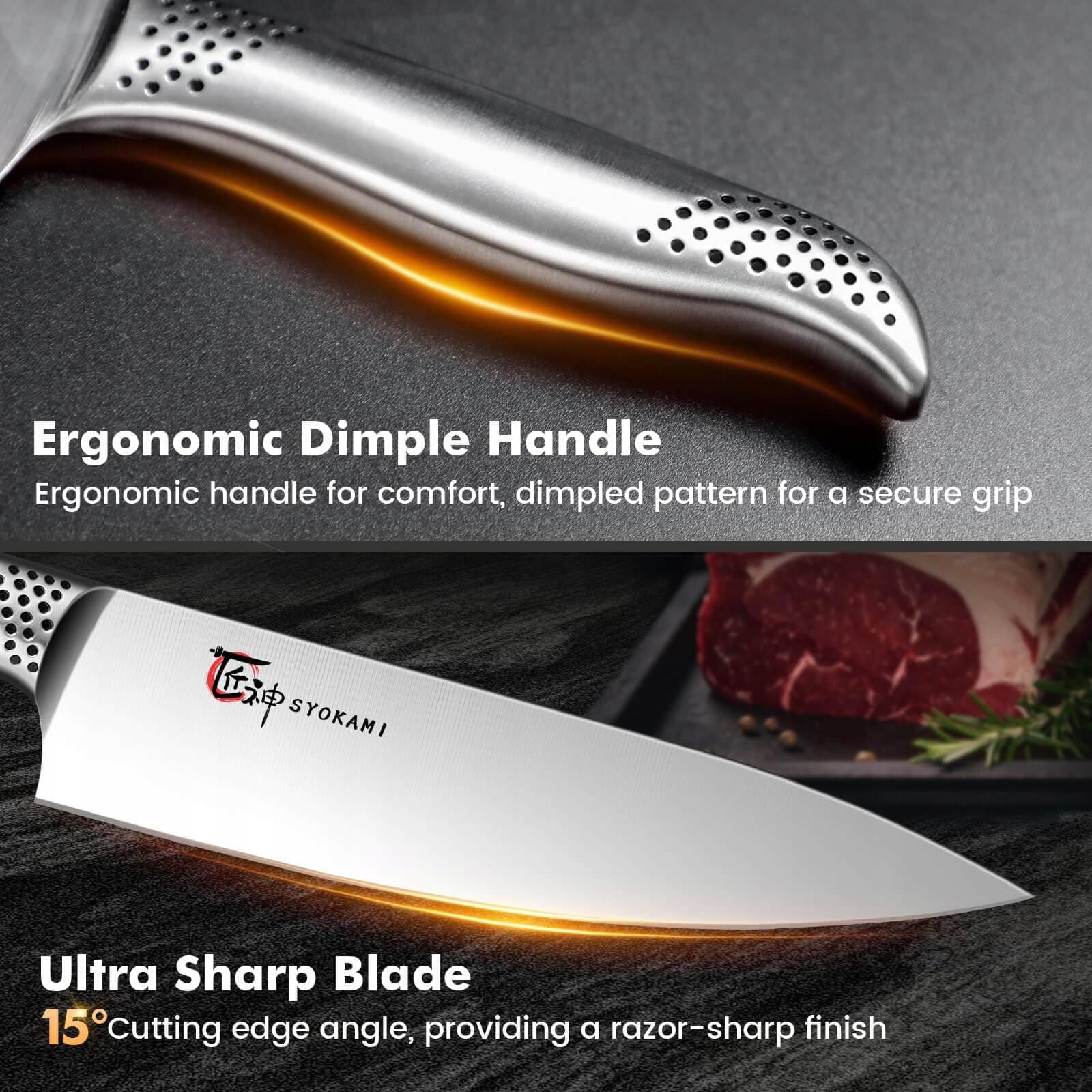 Ergonomiczny, jednolity uchwyt: Zestaw noży posiada bezszwowy, ergonomiczny uchwyt z pełnego metalu, który wygodnie leży w dłoni. Antypoślizgowa powierzchnia zapewnia pewny chwyt i bezpieczne użytkowanie, nawet podczas długiego gotowania.