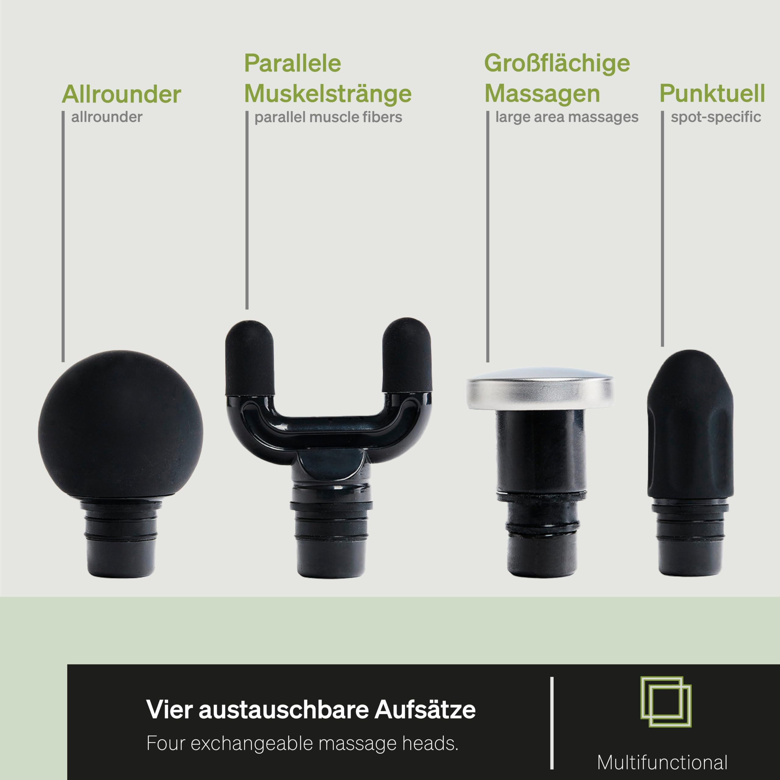 4 KOŃCÓWKI MASAŻOWE: Rozluźnij napięcia i zafunduj sobie lub swojemu partnerowi relaksujący masaż. METAL FLAT do głaskania skóry, z olejkiem do masażu lub do stosowania na ubraniach. SILICON BALL zapewnia dobry chwyt i nadaje się do masażu całego ciała. SILICON FORK do stosowania na równoległych włóknach mięśniowych. SILICON TRIGGER szczególnie pomaga w rozluźnianiu lokalnie stwardniałego tkanki i sklejonych powięzi.
