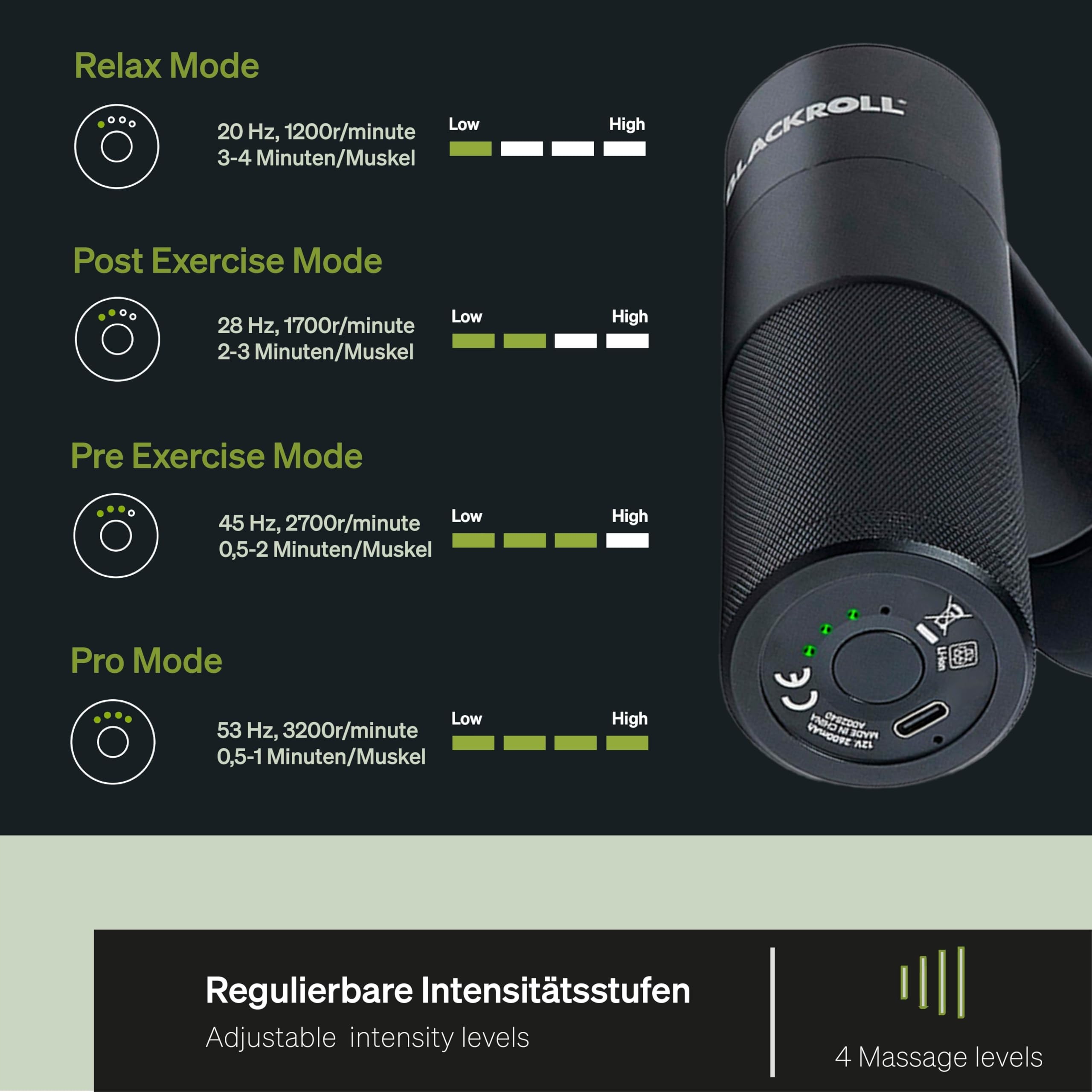 4 POZIOMY MASAŻU: POZIOM 1 -Relaks- działa z niską częstotliwością i idealnie nadaje się do relaksu. POZIOM 2 -Po ćwiczeniach- pistolet do masażu nadaje się do schłodzenia i regeneracji po intensywnym treningu. POZIOM 3 -Przed ćwiczeniami- wspomaga krążenie, co pozwala osiągnąć zwiększoną ruchomość. POZIOM 4 -Tryb Pro- ten intensywny poziom pistoletu do masażu fitness może być dobrze stosowany na dużych grupach mięśniowych. Zalecamy jego użycie przed sesjami treningowymi.