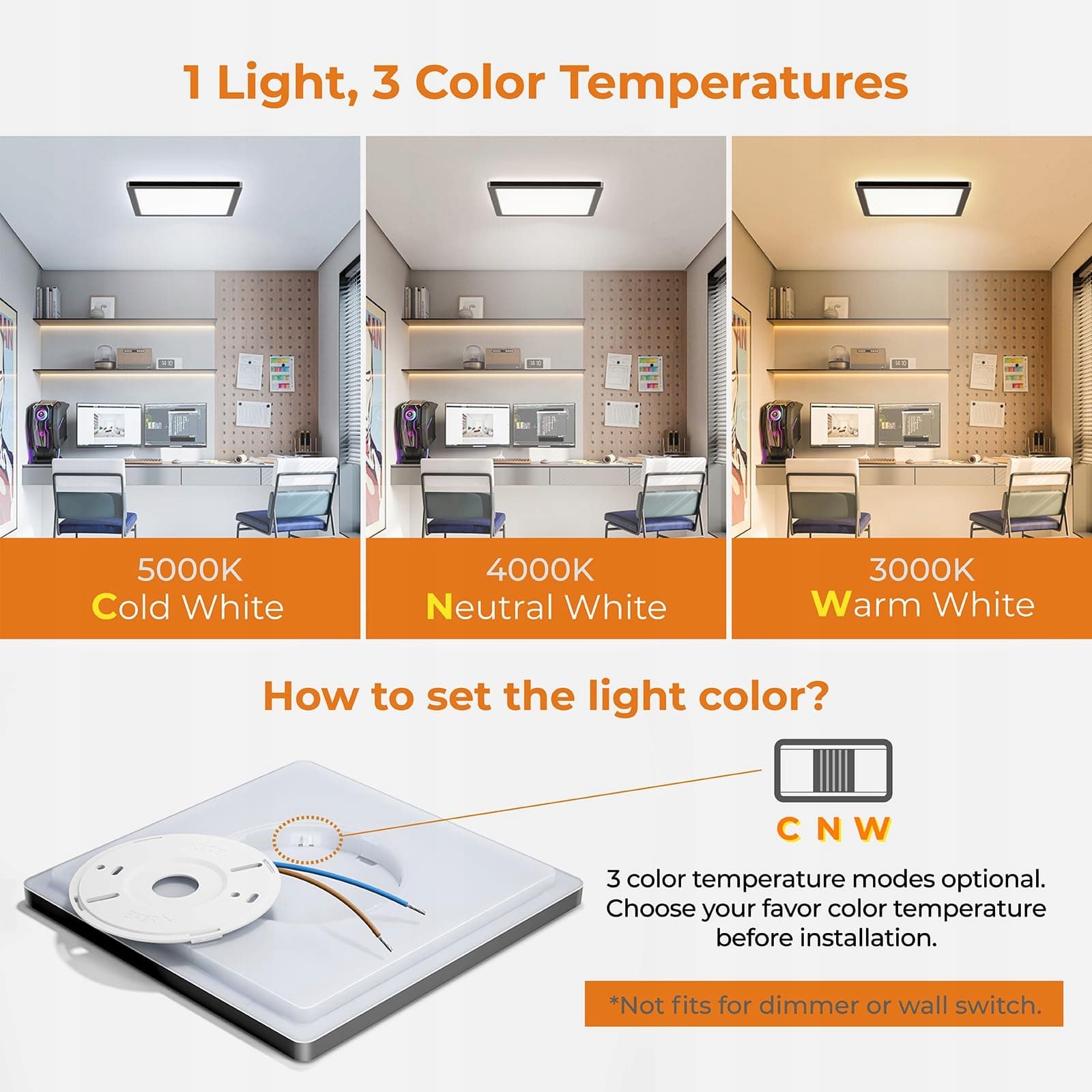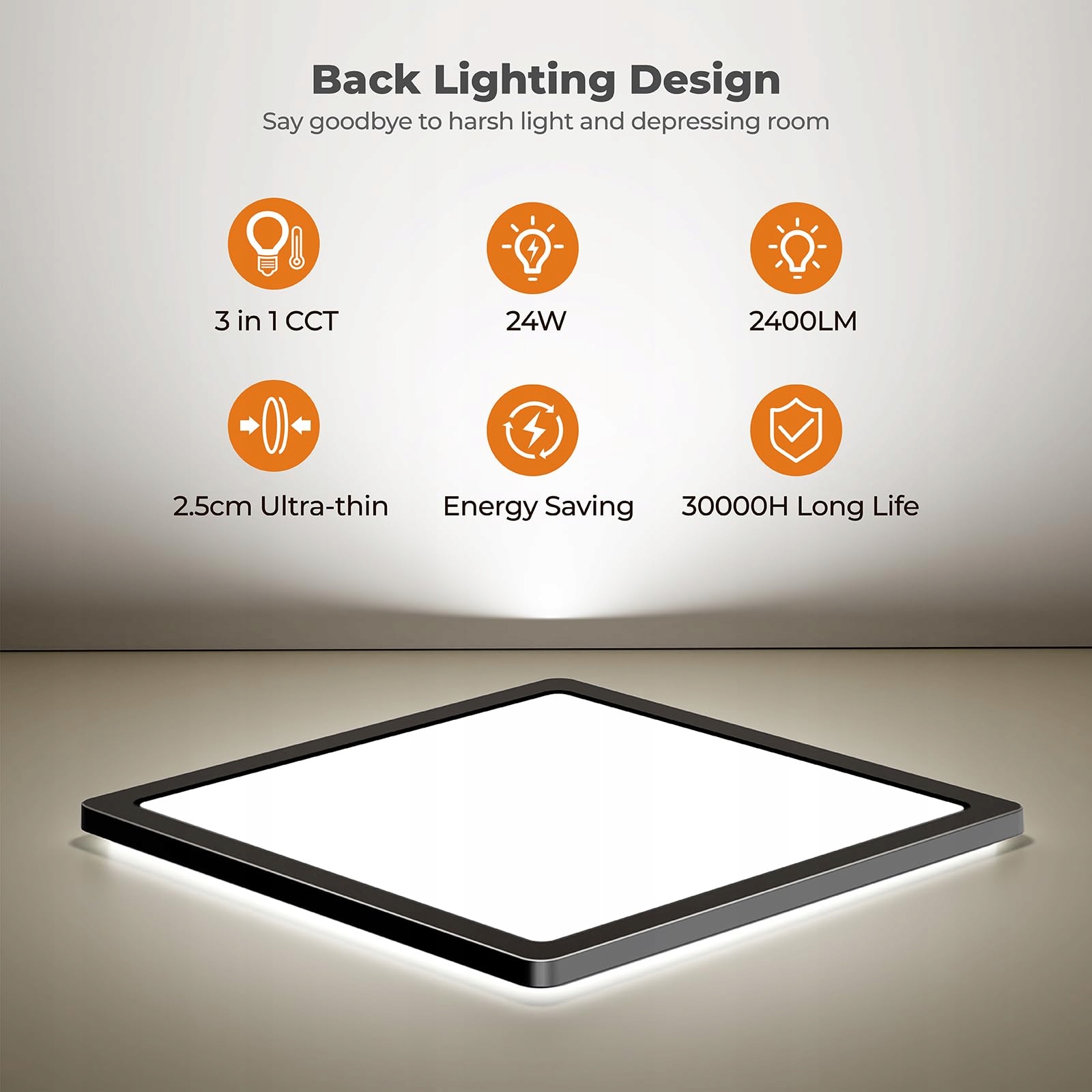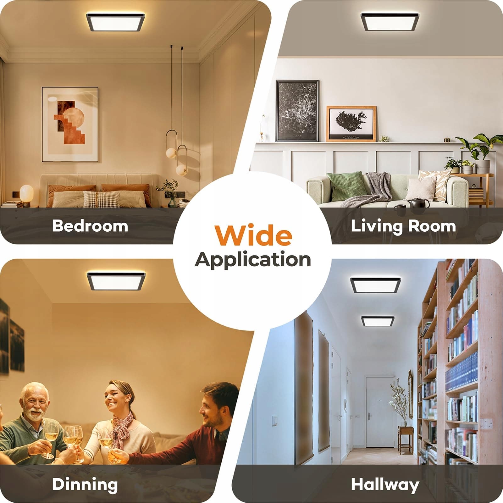 Ultra cienka i podświetlenie: 2,5 cm ultracienki wygląd sprawia, że panel LED wygląda na cieńszy; Tył lampy sufitowej wykonany jest z materiału o wysokiej przepuszczalności, który stworzy piękną aureolę; Idealna do niskich sufitów i różnych stylów dekoracyjnych, takich jak sypialnie, kuchnie, łazienki, jadalnie, klatki schodowe, piwnice, garaże, balkony i inne.
