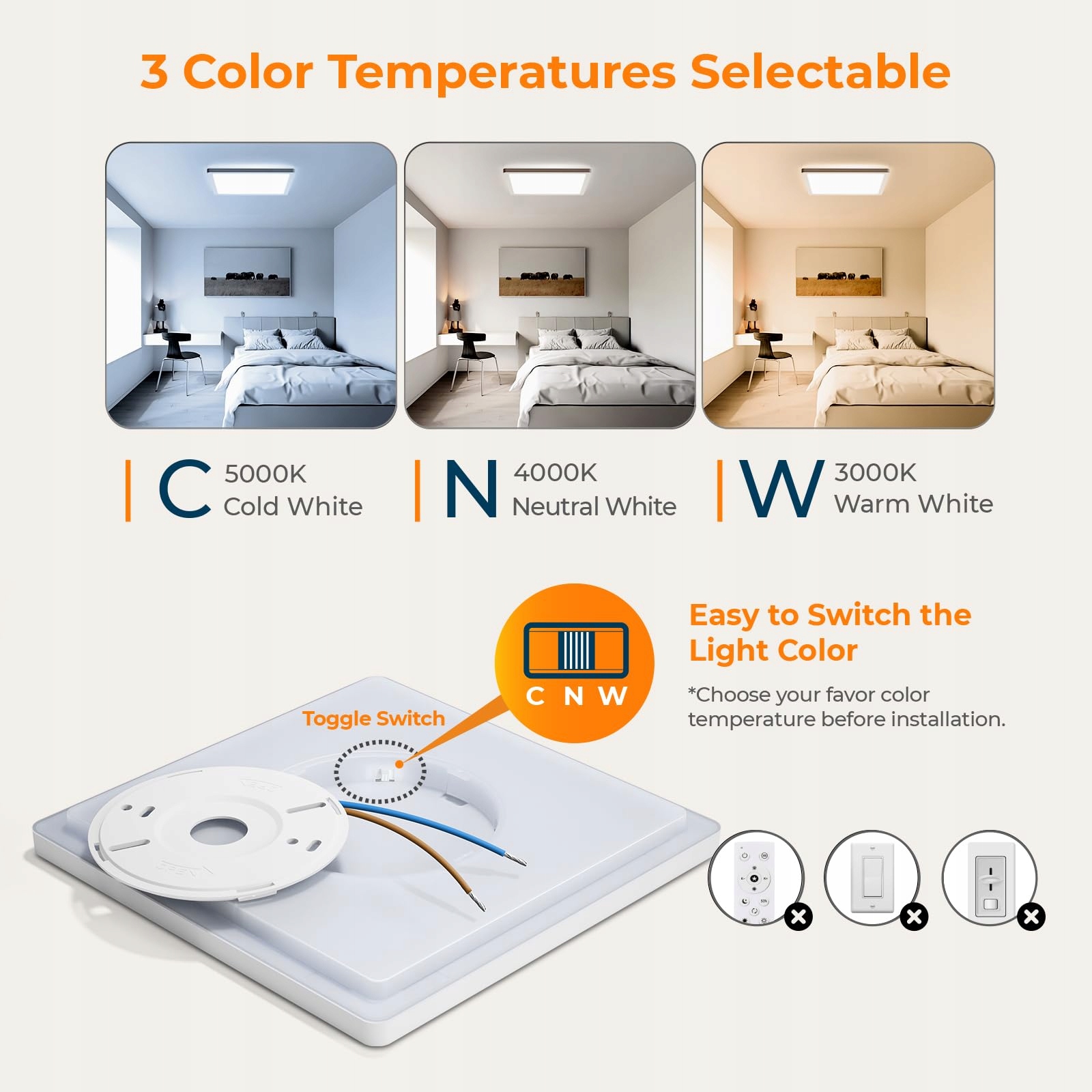 3 Ustawialne temperatury barwowe: Za pomocą przełącznika suwakowego z tyłu lampy można przełączać światło na 3 temperatury barwowe; Ciepła 3000K do posiłków, Neutralna 4000K do wypoczynku, Zimna 5000K do czytania; Możesz dostosować kolor do różnych scen i stylów dekoracyjnych. (Niekompatybilna z ściemniaczami)