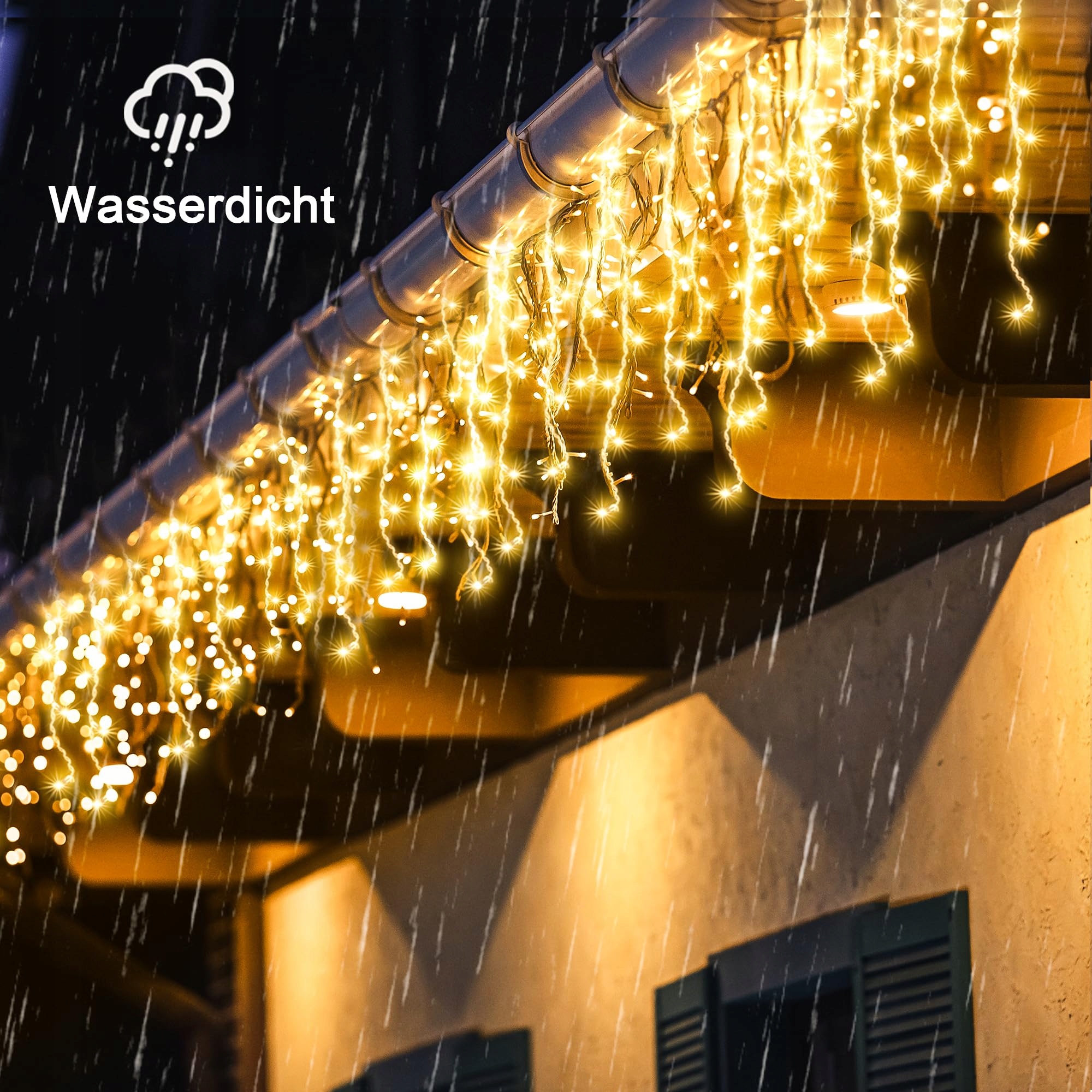 Łańcuch świetlny na zewnątrz: Ten łańcuch świetlny z 720 diodami LED w kształcie sopli lodu z wtyczką ma długość 20 metrów i jest dostarczany z 5-metrowym kablem zasilającym. Łącznie jest 120 zawieszek o długościach 30-70-40-60 cm. Liczba żarówek wynosi 3-7-4-6. Jest wystarczająco długi i bardzo jasny, co czyni go doskonałym wyborem do stworzenia ciepłej, przytulnej i atrakcyjnej atmosfery.
