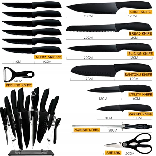 【16-CZĘŚCIOWY profesjonalny nóż kuchenny】 Zawiera nóż kuchenny 8-calowy-20cm, nóż do krojenia 8-calowy-20cm, nóż Santoku 7-calowy-18cm, nóż do chleba 8-calowy-20cm, nóż uniwersalny 5-calowy-12.5cm, nóż do warzyw 3,5-calowy-9cm, nożyczki kuchenne, ostrzałkę do noży, aby pozostały ostre, oraz 6 sztuk noży do steków 4,5-calowych-11cm, obierak, akrylowy uchwyt na noże.