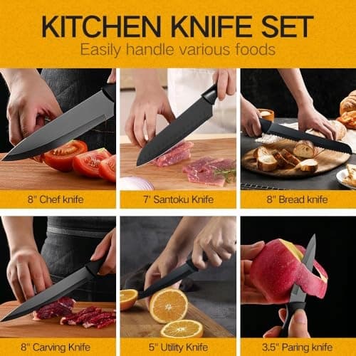 【WYSOKIEJ JAKOŚCI TECHNOLOGIA POWŁOKI】 Ten zestaw noży składa się z wysokiej jakości ostrzy ze stali nierdzewnej o wysokiej zawartości węgla dla precyzji i dokładności. Każdy element jest pokryty chemikaliami wolną czarną karbonizowaną powłoką nieprzywierającą o wysokiej temperaturze, odporną na blaknięcie, przebarwienia, rdzewienie, ciepło i uderzenia. Powłoka utleniająca sprawia, że powierzchnia noża nie jest lepka i łatwa do czyszczenia.