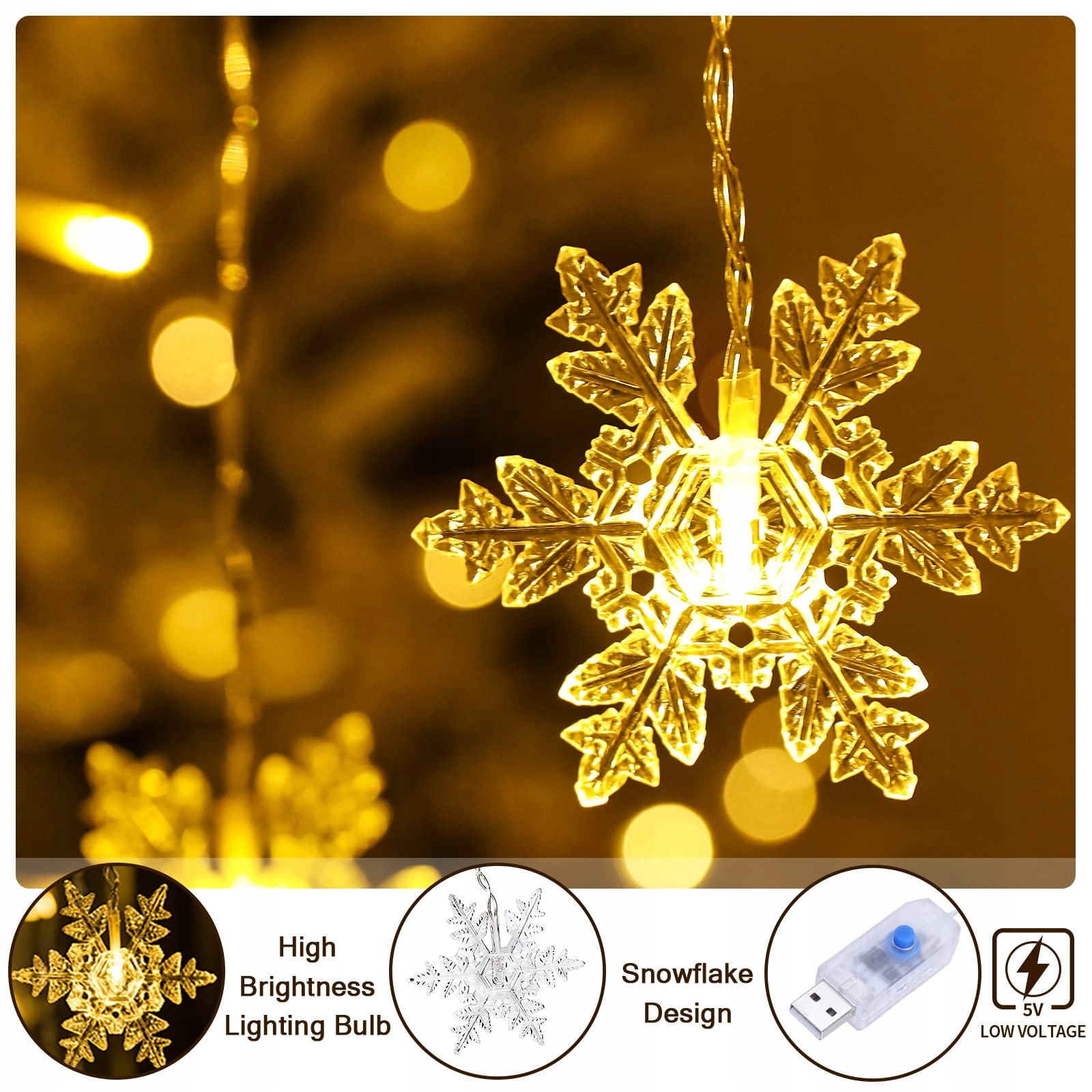 Obsługa USB: Kurtyna świetlna w kształcie płatków śniegu jest łatwa do zamontowania dzięki pomysłowi na wtyczkę USB. Prawdopodobnie większość osób ma w domu zbędny zasilacz USB. Wystarczy podłączyć do power banku, gniazdka sieciowego lub interfejsu USB komputera. (Brak dostępnego zasilacza. Należy go zakupić.)