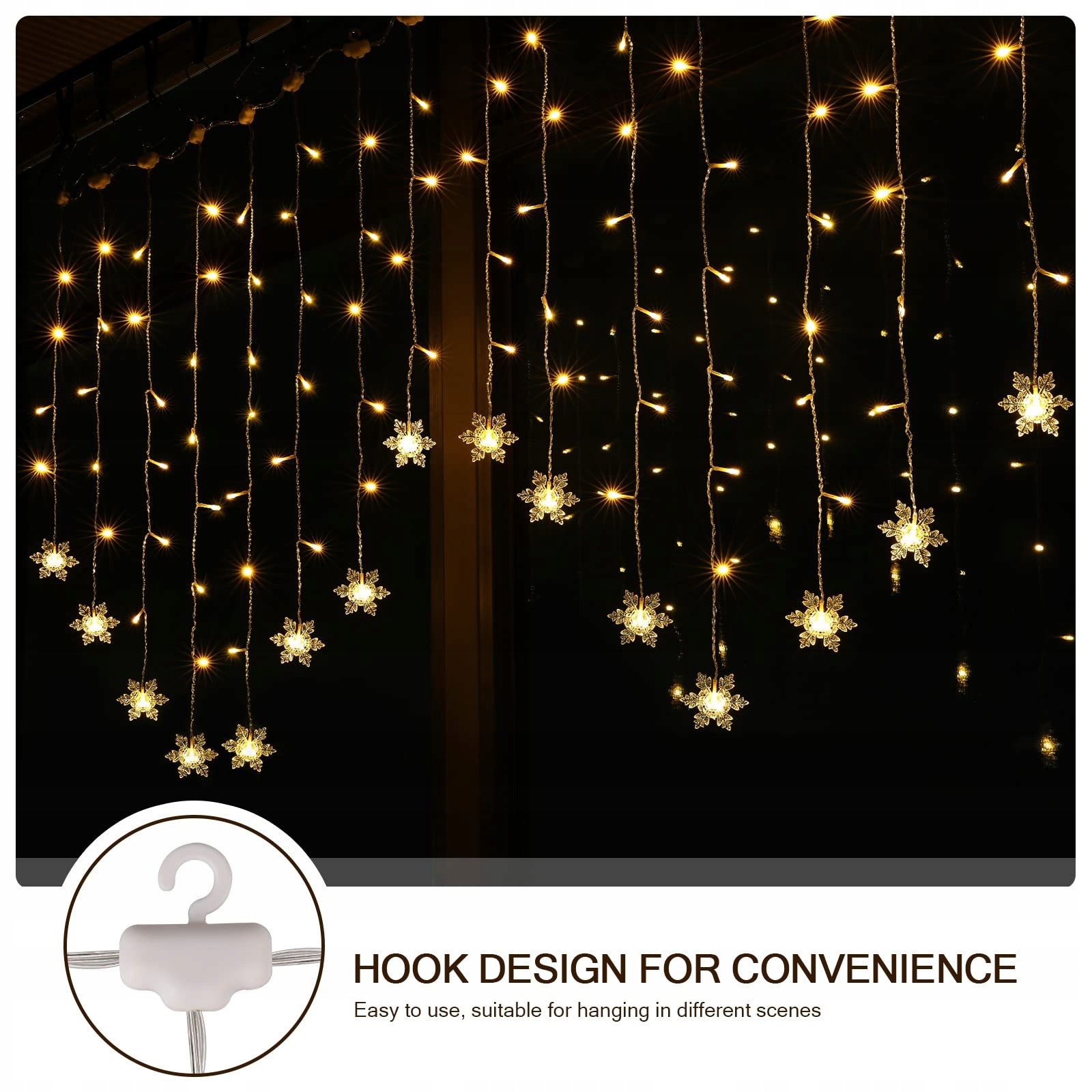 Praktyczne oświetlenie dekoracyjne: Ta kurtyna świetlna w kształcie płatków śniegu 2x1M wykorzystuje interfejs USB z 104 diodami LED i klasą ochrony IP44. Nie wymaga transformatora ani dodatkowego okablowania. Plug and play.