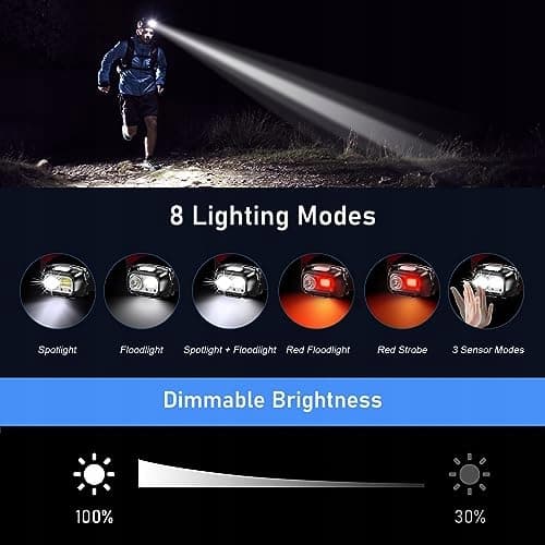 8 Trybów & Czujnik: 5 Ogólnych Trybów Oświetlenia – XPG Białe Światło - COB Białe Światło - XPG & COB Białe Światło - COB Czerwone Światło - COB Czerwone Światło SOS. W tym trybie, jeśli przez 8 sekund nie ma żadnej operacji, naciśnij przycisk, a lampa się wyłączy. 3 Tryby Czujnika – XPG Białe Światło - COB Białe Światło - XPG & COB Białe Światło. W tym trybie, latarka czołowa może być włączana/wyłączana, poruszając ręką w odległości 15 cm przed latarką czołową.