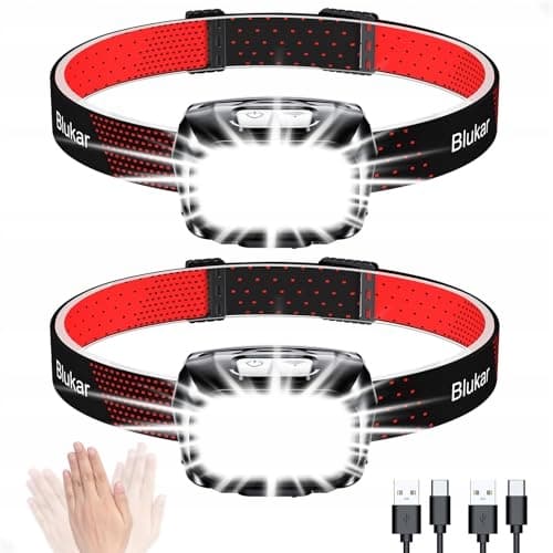 Blukar LED Czołówka Ładowalna, 2 sztuki Superjasna Latarka Czołowa Płynnie Dimmable z 8 Trybami, Czujnik & Czerwone Światło, IPX5 Wodoodporna & Kąt Regulowany, Latarki Czołowe do Biegania, Wędkowania -Czarna