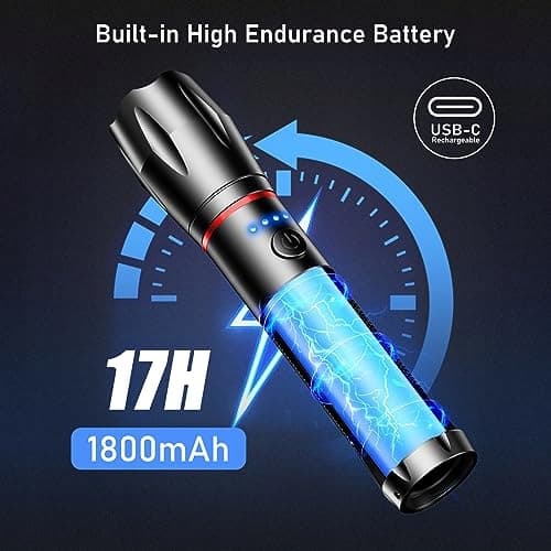 USB C Ładowalna: Wbudowany akumulator 1800 mHA oferuje do 17 godzin czasu świecenia. Dzięki standardowemu kablowi USB C (w zestawie) możesz używać nie tylko ładowarki USB do gniazdka, ale także powerbanku, komputera i innych urządzeń do ładowania swojej latarki, co jest szczególnie przydatne na zewnątrz.