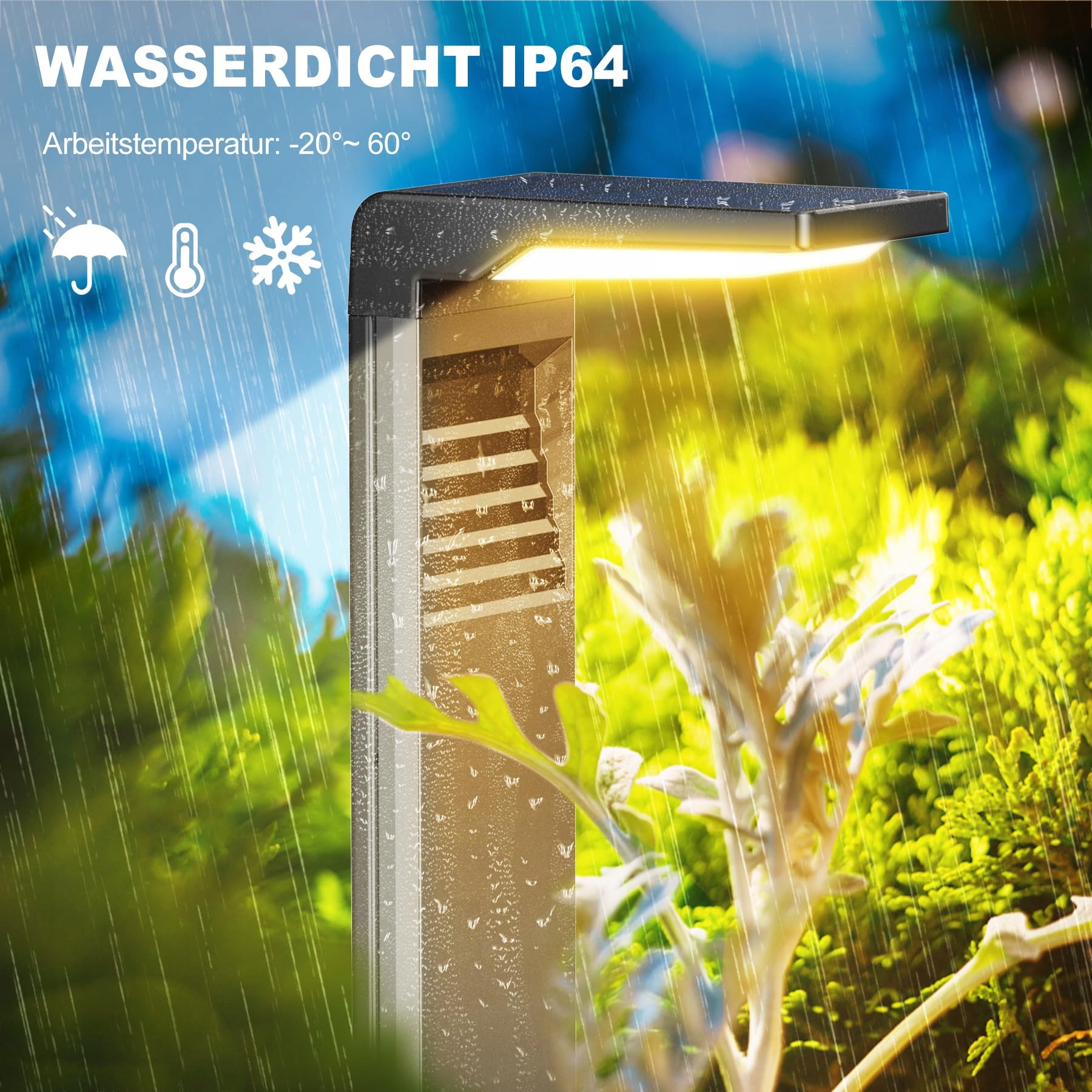 [IP64 wodoodporne]Solarne lampy ogrodowe są wykonane z wysokiej jakości ABS i technologii wodoodpornej IP64, są odporne na promieniowanie UV i korozję oraz wytrzymują różne warunki pogodowe, takie jak deszcz, śnieg, mróz i upał. Można je stosować w temperaturach od -20 do 60°C.