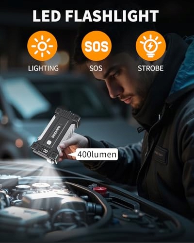 Powerbank rozruchowy do użytku na drodze - Powerbank rozruchowy może dostarczyć impuls i ożywić samochód w mniej niż minutę, służąc jako bezpieczne i niezawodne narzędzie, które pomoże Ci uniknąć ryzyka. Wbudowana latarka z 3 trybami światła ułatwia pracę nocą. To wielka pomoc podczas biwakowania i przetrwania na dziko. Dołączony młotek bezpieczeństwa może rozbić szybę, aby uciec w razie wypadku.