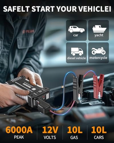 Ultra wydajna powerbank rozruchowa - Ten powerbank rozruchowy do samochodów osobowych dostarcza potężny prąd szczytowy 6000A oraz wskaźnik rozładowania 45C. Ta doskonała wydajność niezawodnie uruchamia do 10L benzyny i do 10L diesla, nawet gdy akumulator jest całkowicie rozładowany. 6000A powerbank rozruchowy do samochodów, ciężarówek, motocykli, SUV-ów, ATV, UTV, dirt bike, skuterów śnieżnych, łodzi, kosiarek, przyczep, kamperów, pojazdów wodnych, jachtów, traktorów i innych.