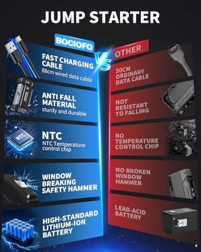 Super bezpieczny powerbank rozruchowy - Ten powerbank rozruchowy oferuje 10 kompleksowych zabezpieczeń, w tym zabezpieczenie przed odwrotną polaryzacją, nadprądem, odwrotnym podłączeniem, przepięciem, przeładowaniem, przeciążeniem, zwarciem, ochroną przed niską/wysoką temperaturą oraz odpornością na iskrzenie. Potężna funkcja rozruchu zapewnia płynne uruchomienie nawet w ekstremalnych temperaturach od -20°C do 60°C.