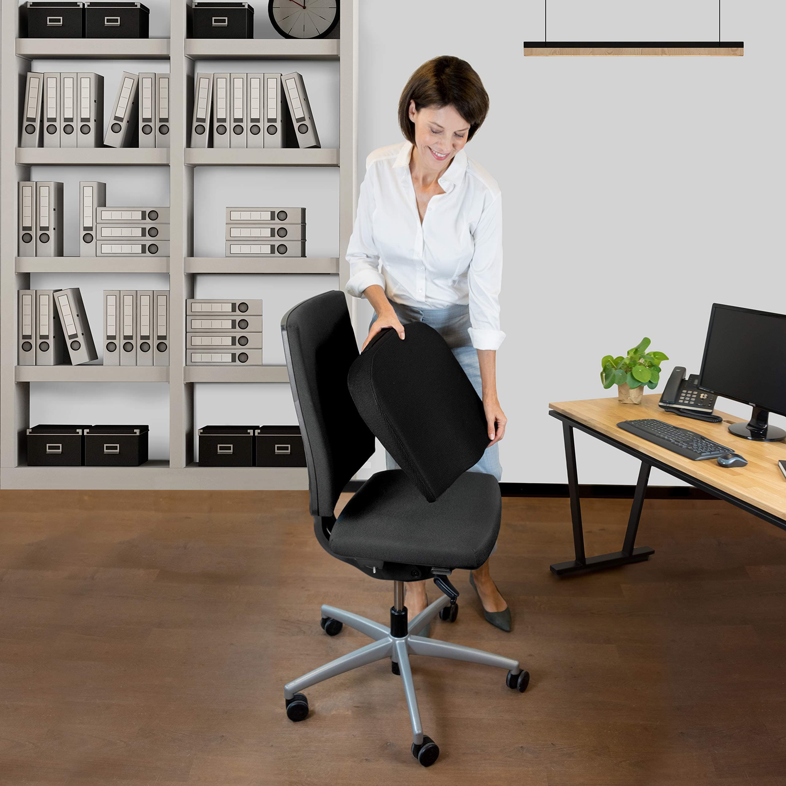 KOMFORTOWY DESIGN - Dopasowująca się pianka Visco-gel oraz oddychający pokrowiec sprawiają, że poduszka na krzesło biurowe jest wygodnym siedziskiem nawet podczas długich dni pracy. Wymiary: 41x39cm